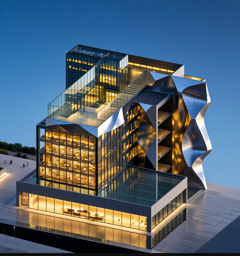ultra realistic contemporary interior render of a custom 3d printing showroom perfectly frontal symmetrical axial perspective view with strong central vanishing point and deep spatial layering toward a secondary production room preserve all existing architectural elements proportions and spatial composition exactly as designed black pigmented microcement floor with extremely fine mineral grain and complex microscopic texture refined matte satin finish with subtle soft reflections and delicate tonal movement seamless continuous poured surface with precise clean junctions at walls massive architectural walls arches columns and wall panelling executed as refined rough plaster casts in warm off white tone fine handcrafted mineral texture with subtle casting irregularities softened edges and controlled tactile depth alternating angular and rounded panel articulation preserved protruding sculptural arches along both side walls containing deep monolithic empty display shelves within the arch openings large mirrors made of textured mercurial glass with very dark reflective quality almost black mirror appearance with irregular depth reflections large wall integrated columns dressed with stacked square panel modules forming rhythmic vertical relief geometry preserved exactly as modelled dedicated filament sample wall composed of precise grid of square plaster cast panels with deep negative impressions within each negative a bulbous organic 3d printed sample element mounted subtle contrast between slightly smoother sample material and mineral panel background exposed technical ceiling composed of dense modular square expanded mesh panels painted matte black visible infrastructural depth above mesh ceiling reading as lightweight industrial layer floating above heavy plaster architecture bright diffused daylight only high ambient illumination with soft shadow gradients enhancing fine material textures and architectural relief no artificial lighting production room visible in background containing simplified industrial 3d printing machines replacing placeholder coloured boxes clean geometric equipment volumes with subtle technical detailing and neutral materiality cinematic architectural visualization wide interior lens high material realism calm experimental gallery showroom atmosphere no furniture styling no decorative staging