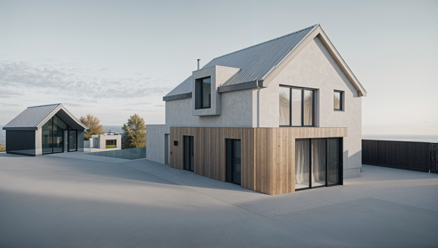 modernist exterior shot ultra realistic render of a modern detached house facade finished with a combination of natural wood cladding and white stucco roof with dark roof tiles set in a green garden with realistic grass and several trees in the background clear sky with light clouds daylight lighting with soft shadows on the right side a wooden fence at the back of the plot a small shed and a veranda high detail architectural visualization photorealistic 8k quality street level perspective showing the house in its natural setting architecture