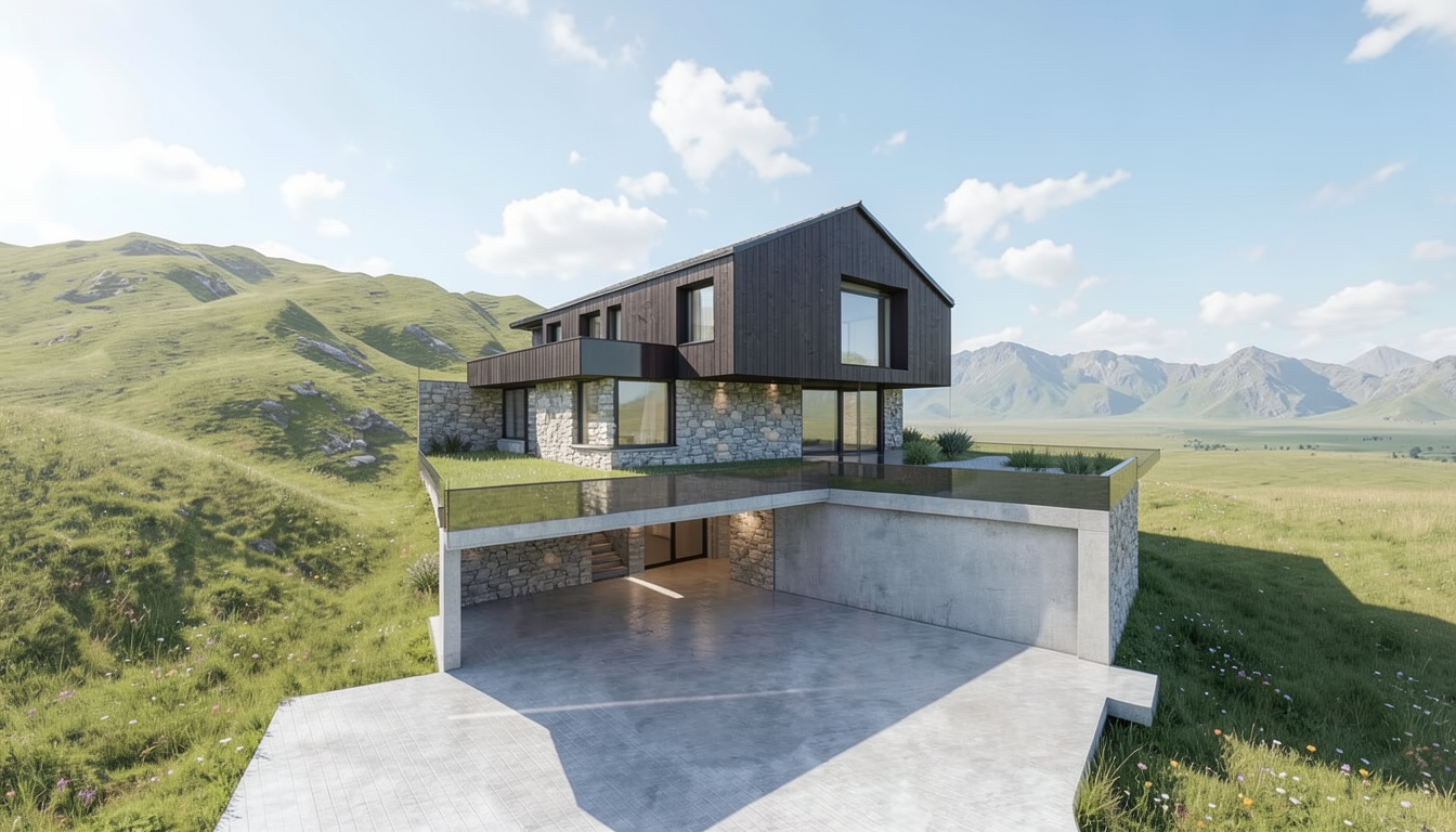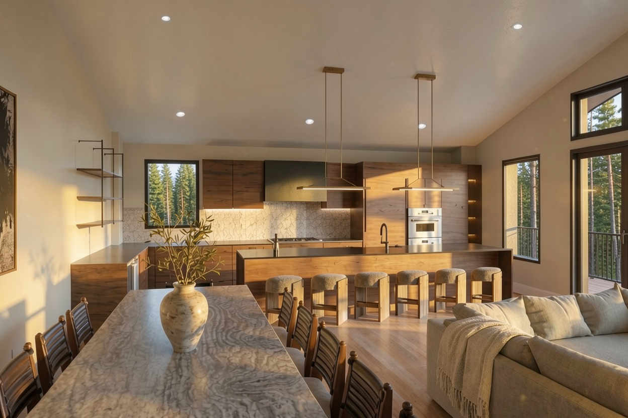 refine this photo realistic rendering by keep everything in this image the same but move the trees outside closer to the window