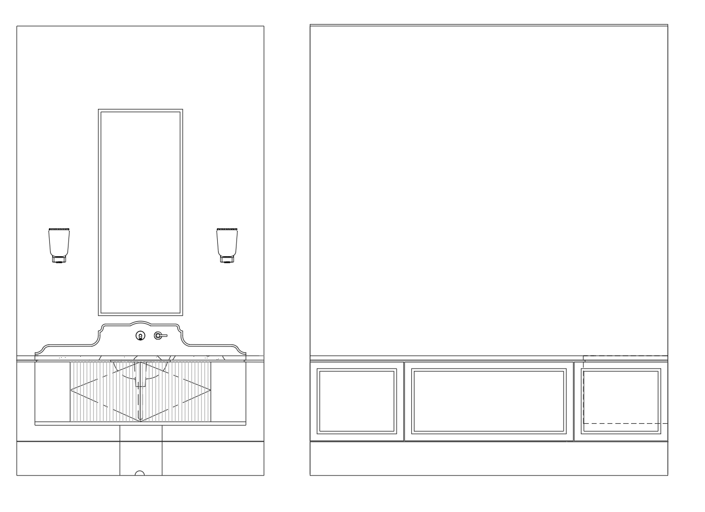 render this bathroom the left elevation is the vanity wall and the right elevation is the wall to the left side of the vanity the wainscoting will be a lacquered off white with wallpaper above