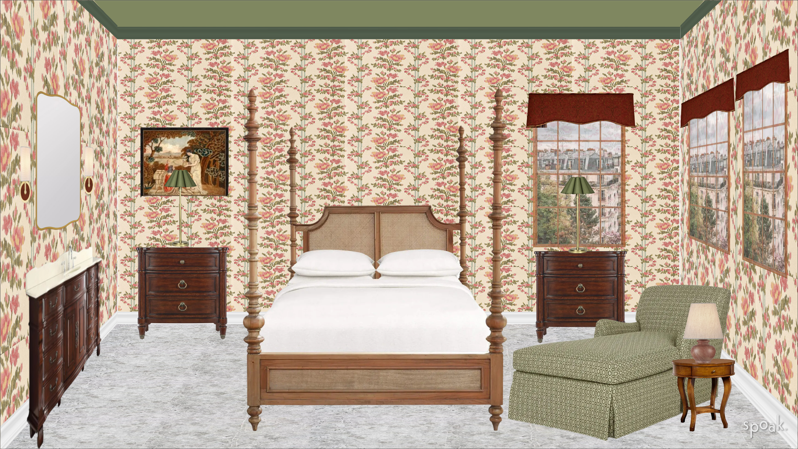 1 add bedding not white to complete the room 2 remove the spoak word from the corner 3 add green and red pillows to the chair