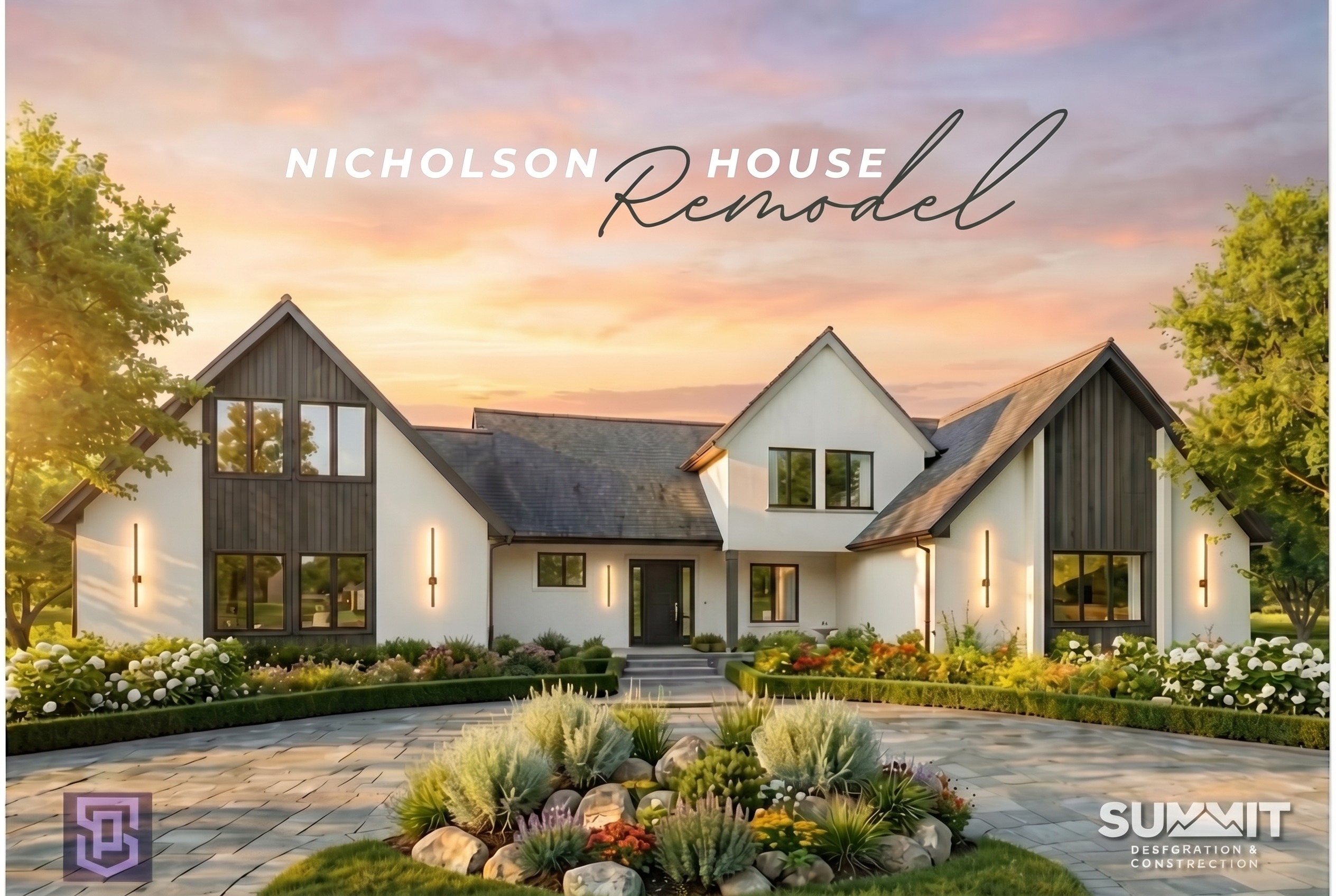 change the dark wood to dark stucco do not change any windows doors siding rooflines materials or proportions of the house do not modify any other areas of the image match perspective lighting and scale to the existing image
