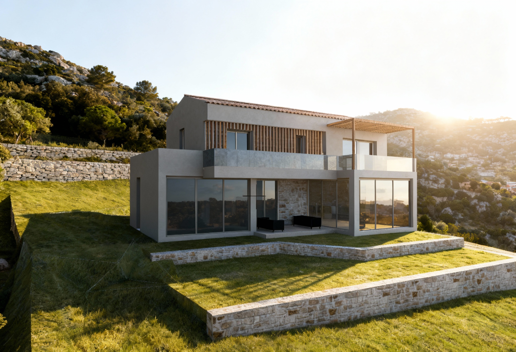 lot of light and reflects in the windows in the hills of la ciotat in south of france lauriers roses lavandes et oliviers