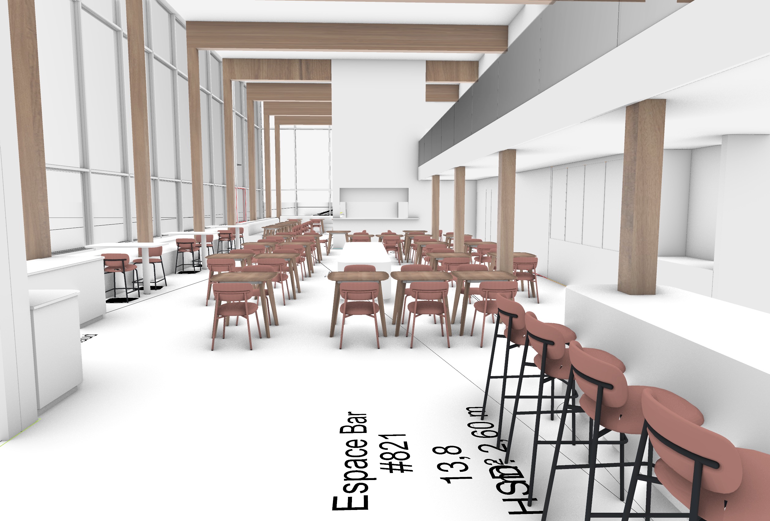 on the floor please put grey ceram big flooring tiles and on the left aligned with te counter volume and the big vlume at the back please plac woodflooring in oak the balustrade glass panels need to be in glass the ceiling is in linen color and its i s ceiling panels of naturel fiber from the knauf brand the main volume at the back is cladded with perforated stainless steel metal panels in the hole in this volume is a kitchen with a cook the bar counter on the right needs to be in light beige travertine also the piece of furniture on the left top is travertine and main part is dark ok wood all tables top in travertine and feets in light oak