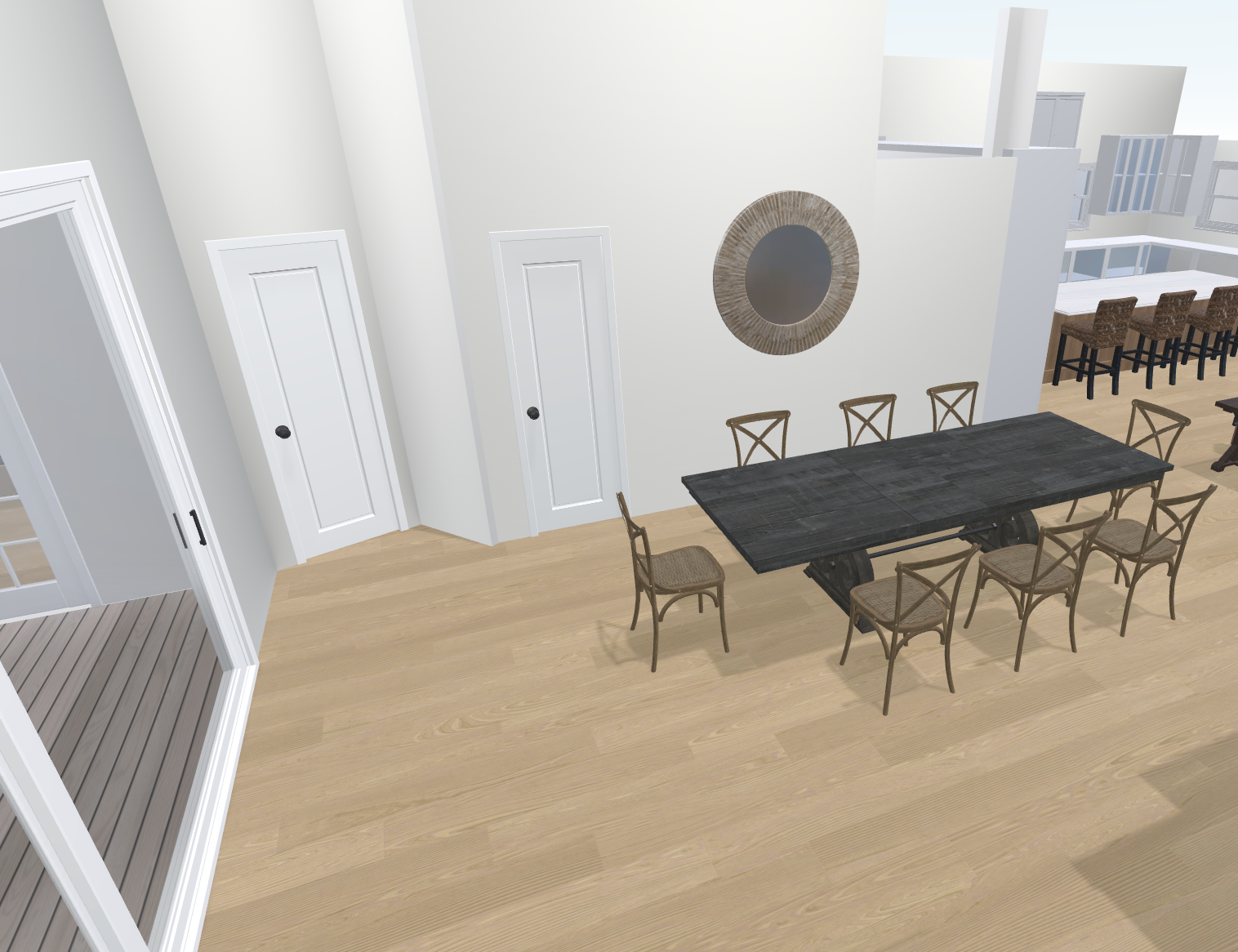dining room leading out to back yard deck big round mirror on wall
