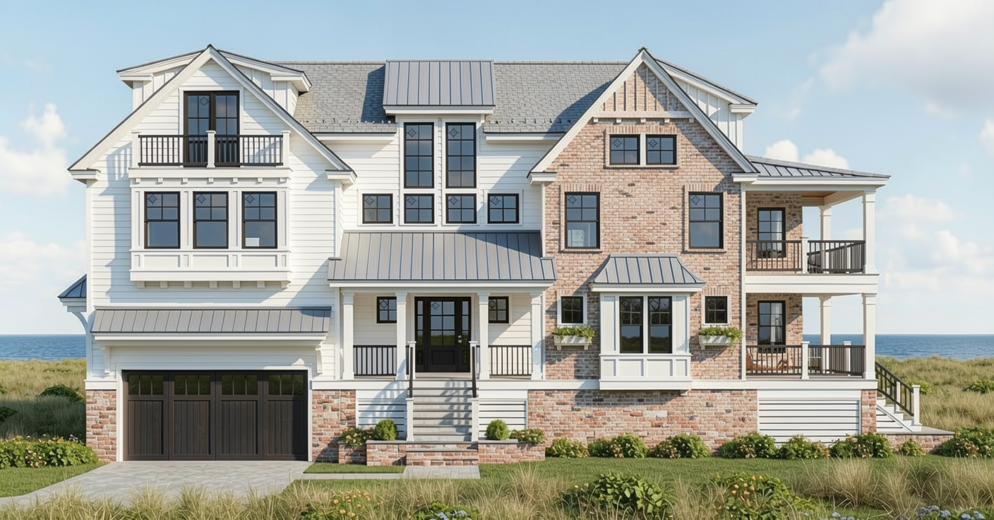 foundation rustic thin brick white siding from foundation to roof black windows gray roof