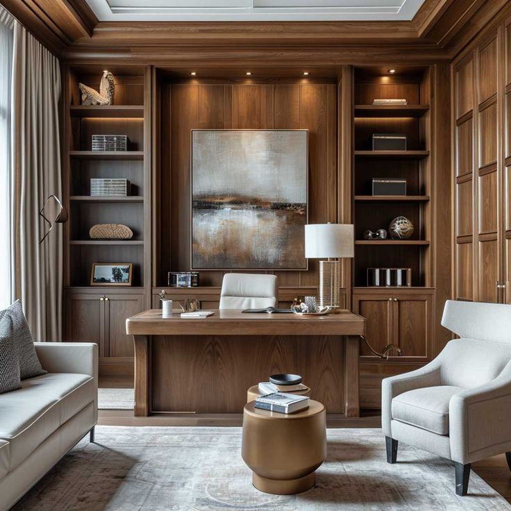 exterior shot create view of wood office with light coming in the ceiling tray should be painted white