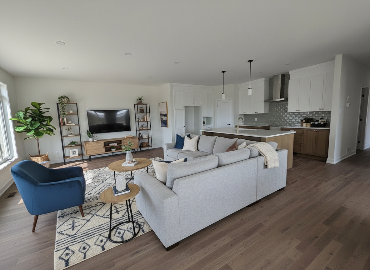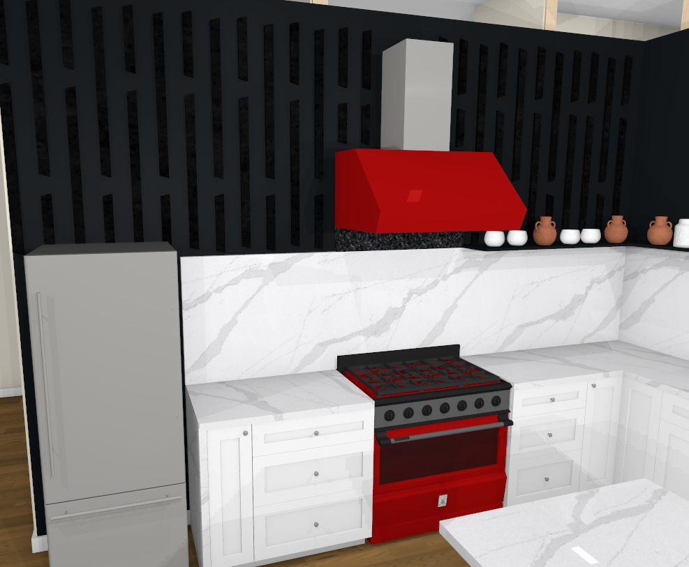 please do not change anything about the architecture or design in this image do not change materials fixtures locations of anything walls etc please keep the black trim that runs under the red hood do not make it stone the red hood and stove should be matte please make the backlighting in this photo brighter coming from behind the photographer