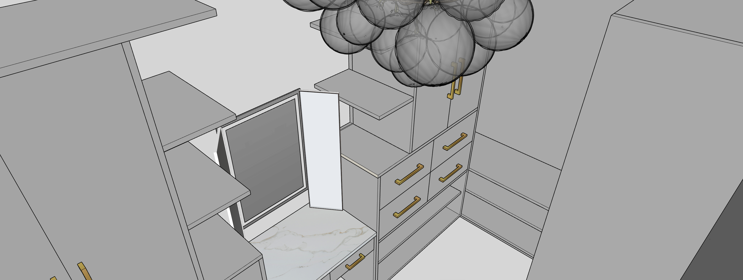 all built ins are oxford white satin finish flooring in white oak texture porcelain tile the center mirror borders are lighted those inclined panels on both sides of the center mirror are mirrors too