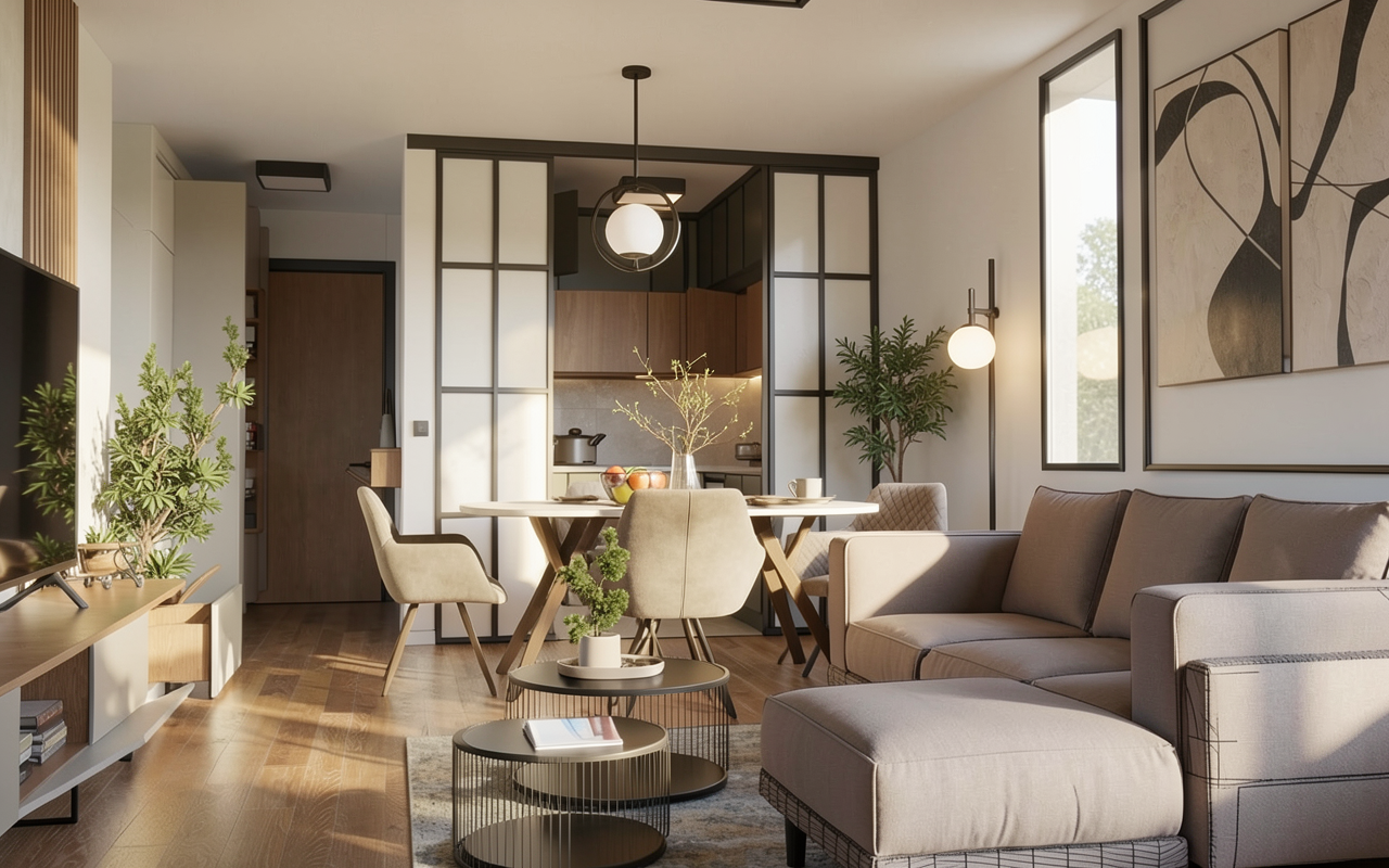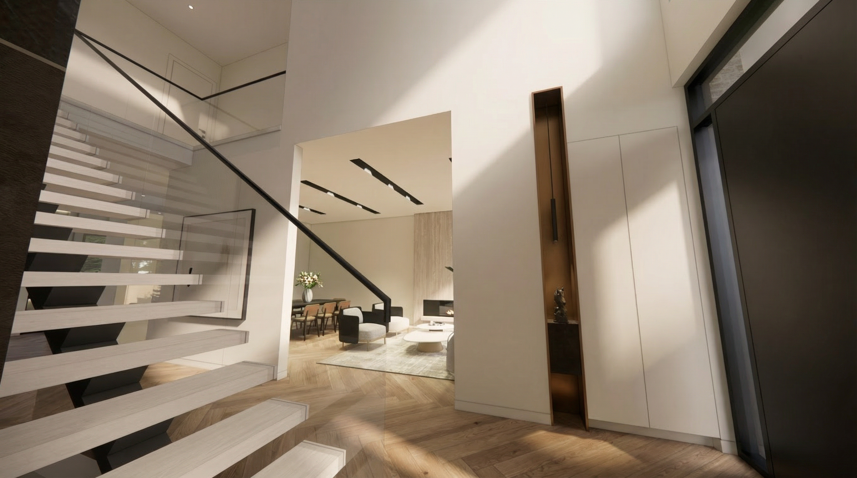 modify only the window mullions inside the existing window frames integrate subtle colored glass panels within the mullion pattern softly translucent and luminous colors limited to pale celadon green warm amber champagne and milky opalescent glass glass remains mostly clear with color appearing as delicate accents and gradients light passes through gently creating a calm and refined atmosphere mullions should be thin elegant architectural and consistent across all windows