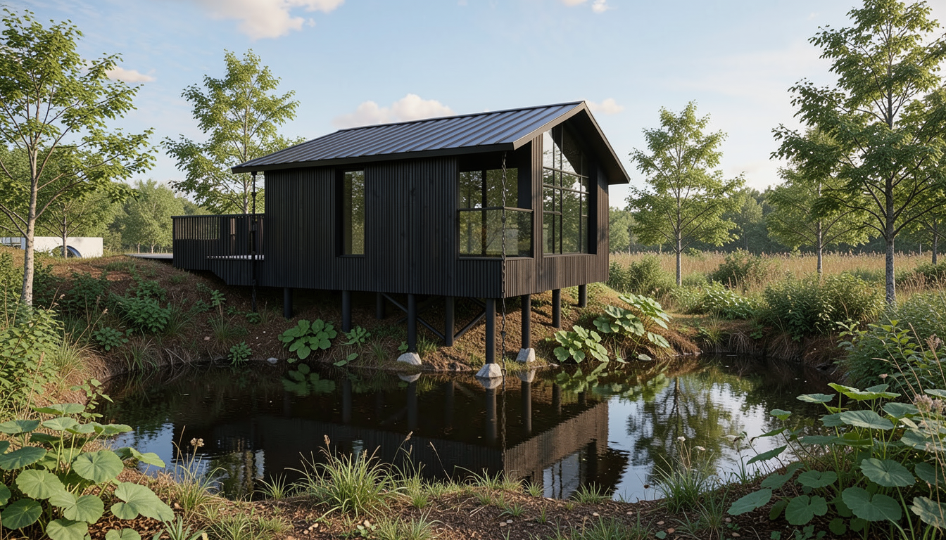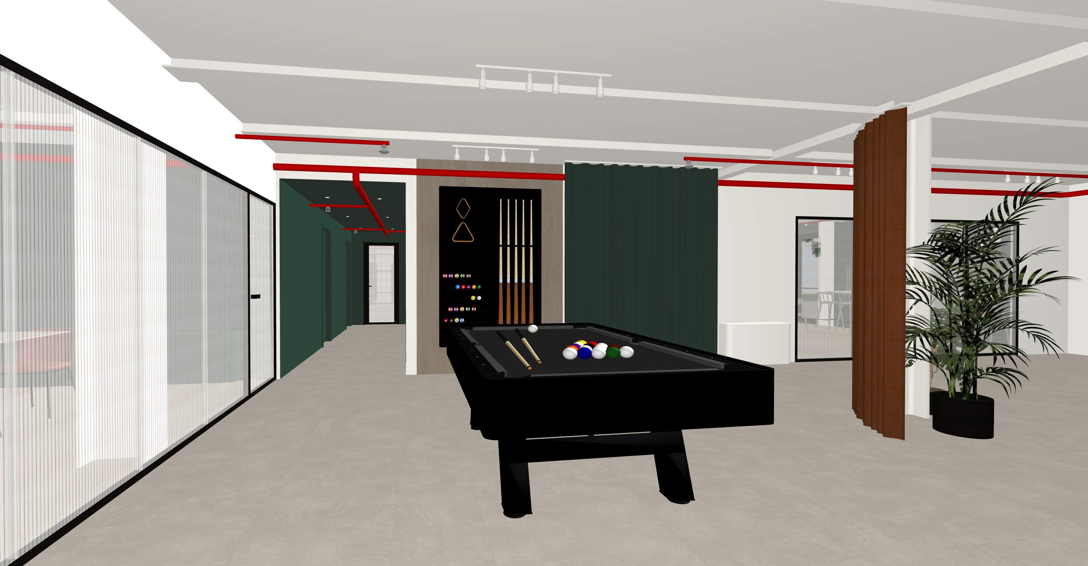 a terra abbiamo un pavimento in linoleum beige chiaro vetro cannettato riflettente non ci sono strip led come illuminazione come illuminazione abbiamo dei binari con faretti a luce calda la struttura del biliardo e il fondale delle stecche in legno laccato nero il bordo superiore del biliardo e la cornice perimetrale delle stecche in legno rovere chiaro a destra del biliardo abbiamo una tenda di colore rosso rame a destra delle stecche abbiamo una tenda di colore verde scuro fai entrare un p di luce naturale