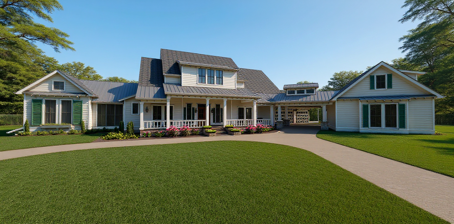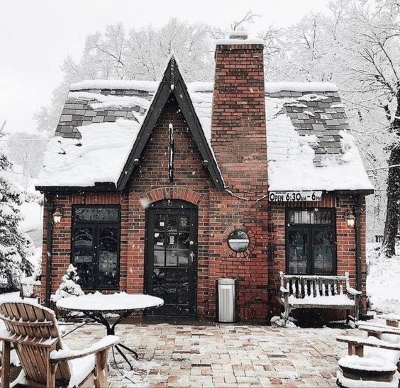exterior shot christmas time winter red brick facade modern house smooth light in window light in window snowing