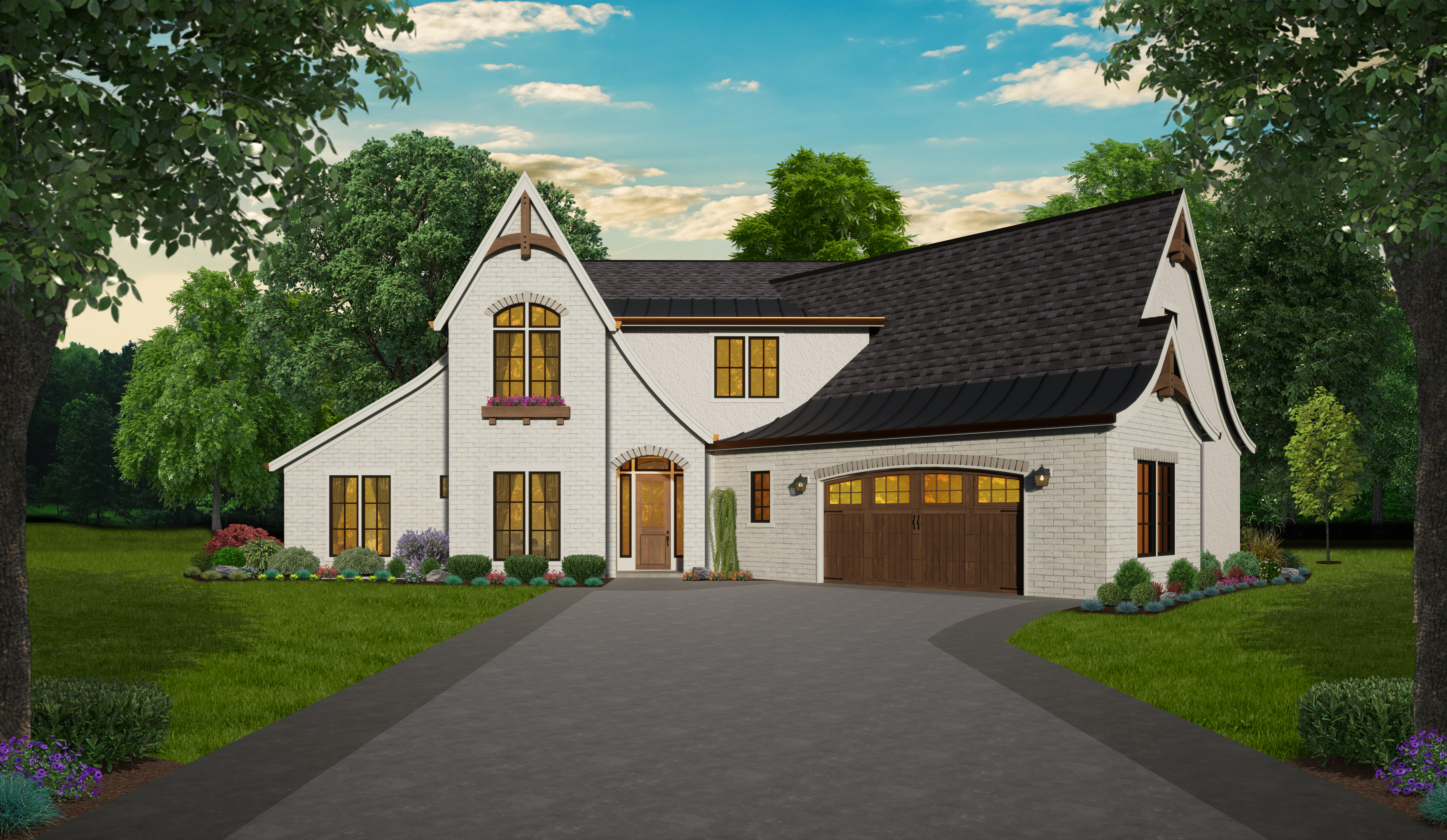 could you add more realistic luxury mature landscaping to this rendering also cvhange the color of the front door to a black frame and add a bit of a sunset to the sky in the back ground architecture