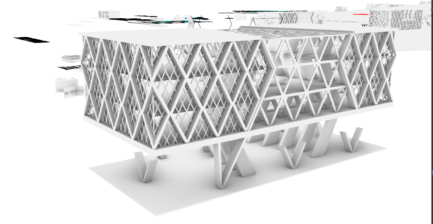 preserve the exact building geometry and overall massing exactly as provided do not change the structural layout emphasize the angled v shaped ground supports as primary structural elements carrying the building above keep the upper diagrid crisp and legible clean architectural clay render soft daylight subtle shadowing eye level perspective realistic structural depth minimal background no people no landscaping no extra facade elements no change to floor count or proportions