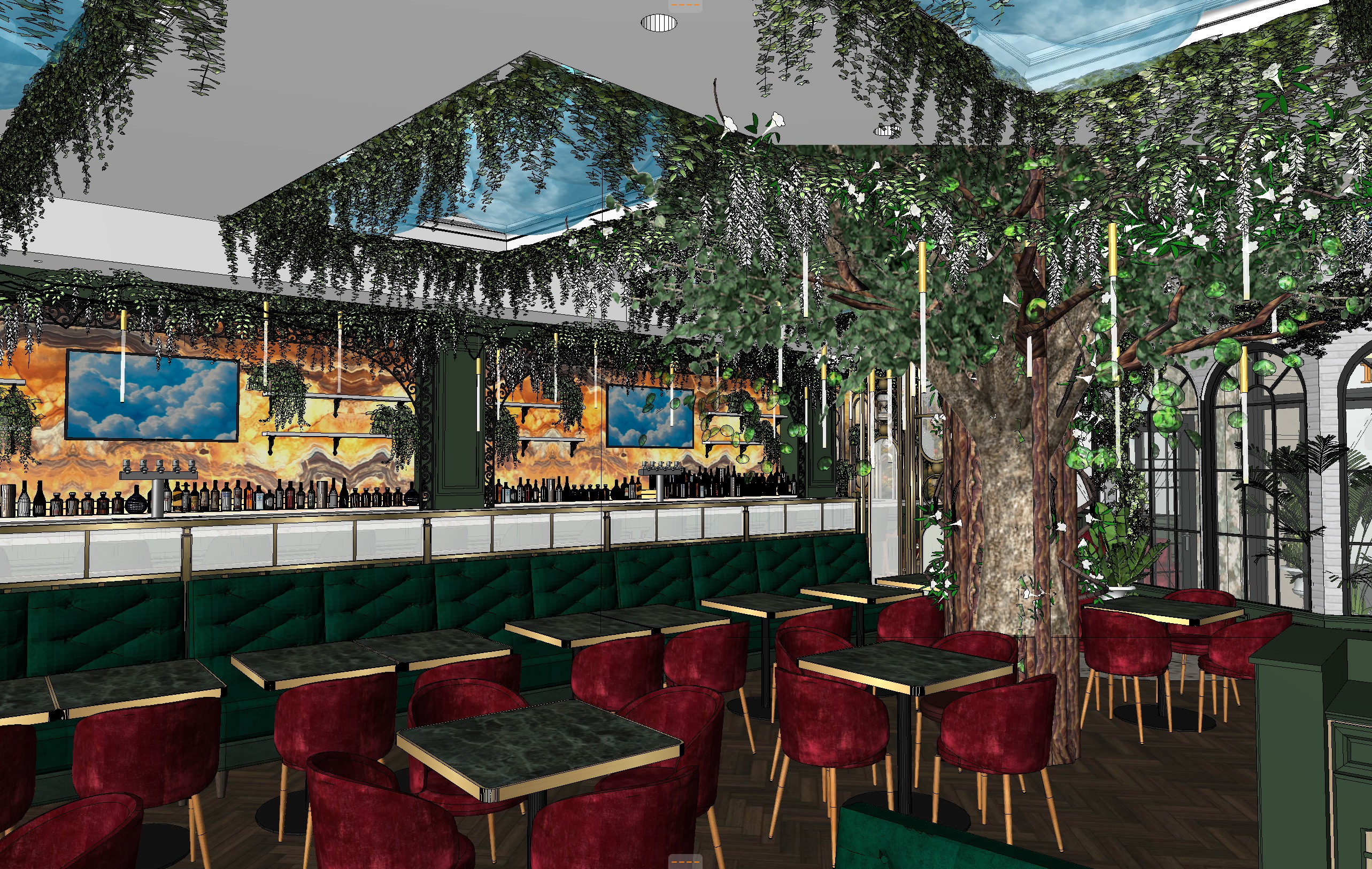 hyper photography ai control prompt ultra photorealistic architectural interior photography of seven restaurant dining area with a strong focus on the sculptural central tree installation and the botanical ceiling environment the render must preserve the exact geometry layout furniture placement and architectural composition of the reference image no redesign no removal of elements the main visual centerpiece is a large sculptural indoor tree the trunk is composed of many intertwined natural branches woven together creating a thick organic structure the branches extend outward beneath the ceiling forming a wide canopy each branch is softly illuminated by small integrated spotlights highlighting bark texture and the structure of the branches from the canopy descend slim vertical pendant lights resembling falling droplets of light these lights appear like glowing rain drops suspended at varying heights creating an elegant atmospheric lighting effect cascading greenery spreads across the ceiling consisting only of ivy vines and white wisteria flowers the white wisteria clusters hang downward delicately from the canopy and ceiling edges above the space large recessed ceiling openings contain cloud lighting installations showing a dramatic grey blue sky with subtle thunder and lightning effects creating the illusion of storm clouds above the restaurant interior dining tables are arranged around the tree and are fully set with hospitality table settings including wine glasses water glasses plates napkins and cutlery dining chairs are upholstered in deep burgundy velvet with elegant slender legs velvet texture must appear rich and soft with realistic fabric sheen banquettes along the wall are upholstered in deep emerald green velvet with a quilted pattern behind the banquettes a partition of fluted glass panels softly diffuses light and adds depth to the interior in the background the main bar is visible featuring a glowing backlit amber onyx wall with dramatic natural patterns the bar shelves are filled with numerous liquor bottles decanters and glassware slim vertical tubular pendant lights hang above the bar area as well the floor is dark natural wood parquet with visible wood grain materials must appear extremely realistic velvet fibers bark texture on the tree leaf translucency polished stone reflections on tables glass reflections on bottles and drinkware brushed brass details lighting combines soft daylight from ceiling openings with warm hospitality lighting from interior fixtures branch lighting and drop pendant lights professional architectural photography style full frame camera simulation with 24 35mm architectural lens eye level perspective with strong spatial depth and balanced composition exposure must resemble real photography with natural highlights and soft shadows no cgi look no artificial rendering artifacts hospitality amazing photography extremely realistic materials cinematic depth ultra realistic architectural photography with physically accurate lighting natural global illumination and realistic material reflections plants show natural leaf translucency and organic variation liquids in glasses show realistic refraction and subtle color the image must look like a real luxury restaurant photographed for an architecture and hospitality design magazine
