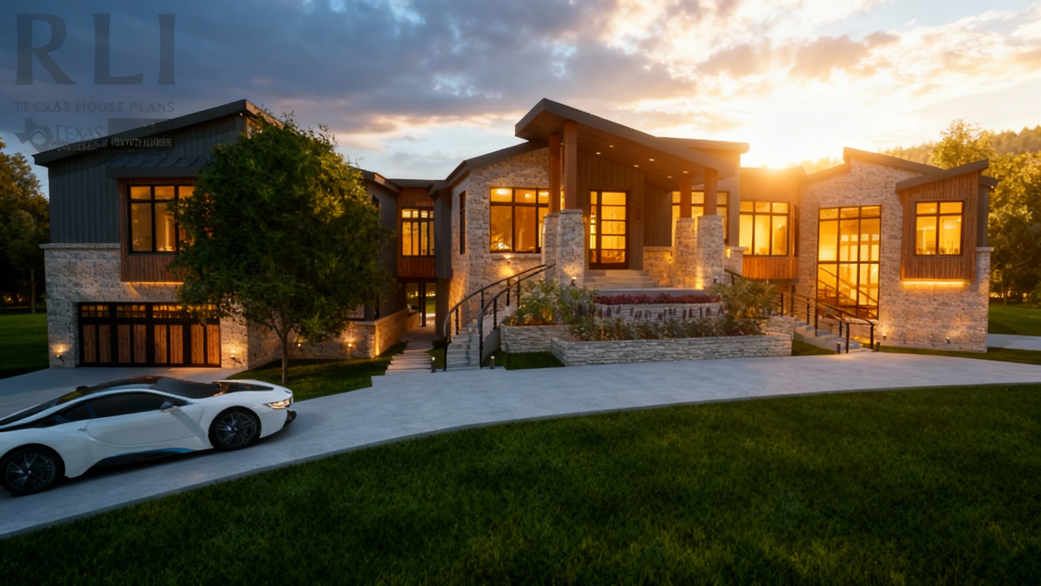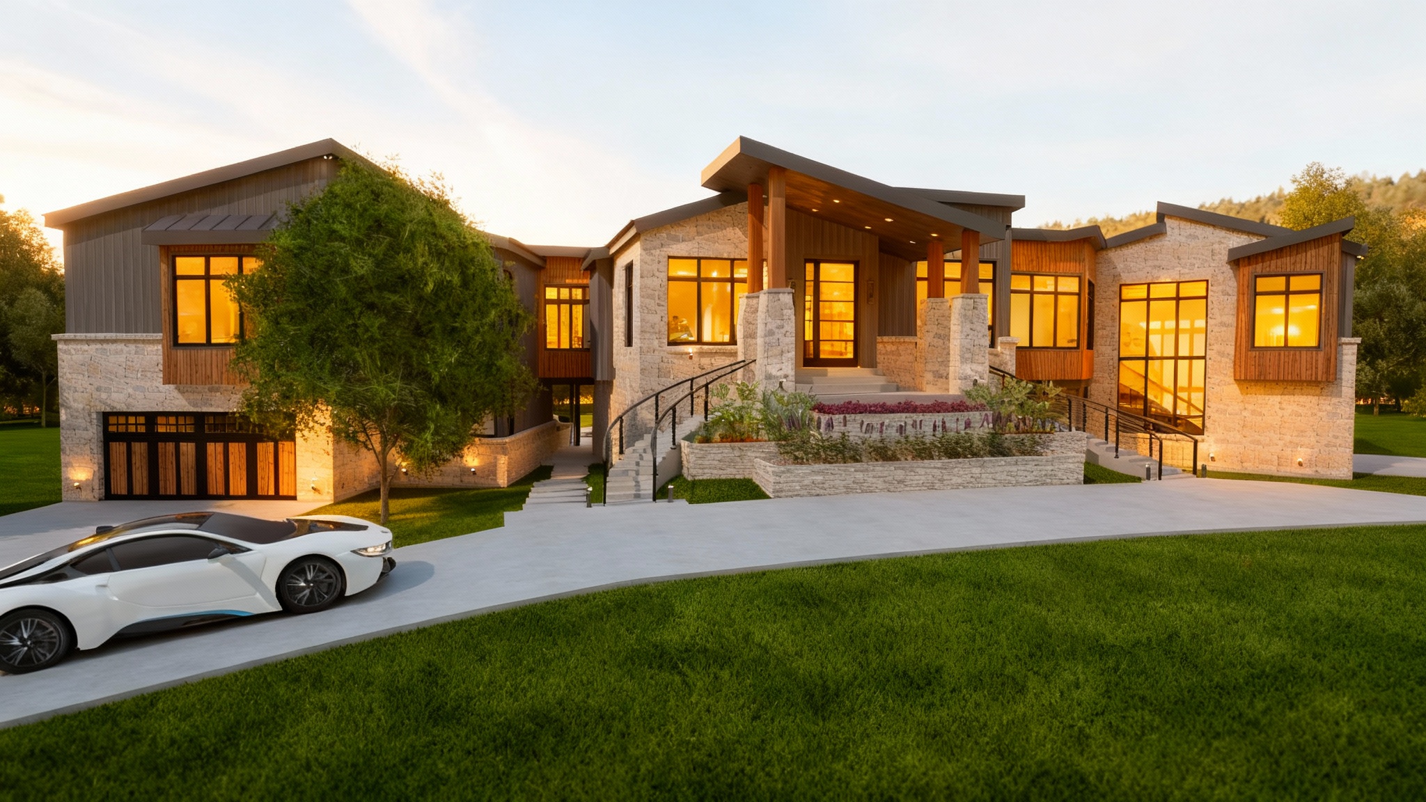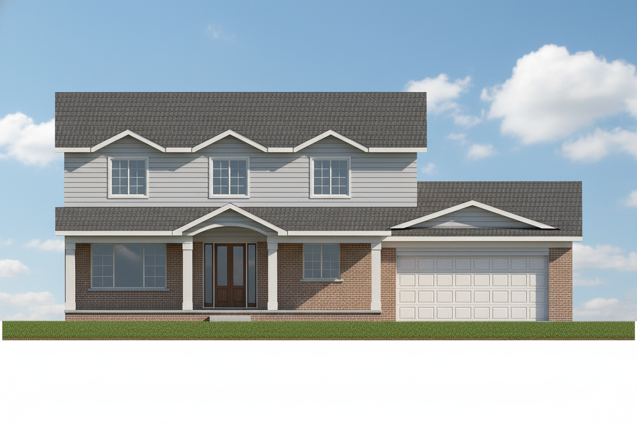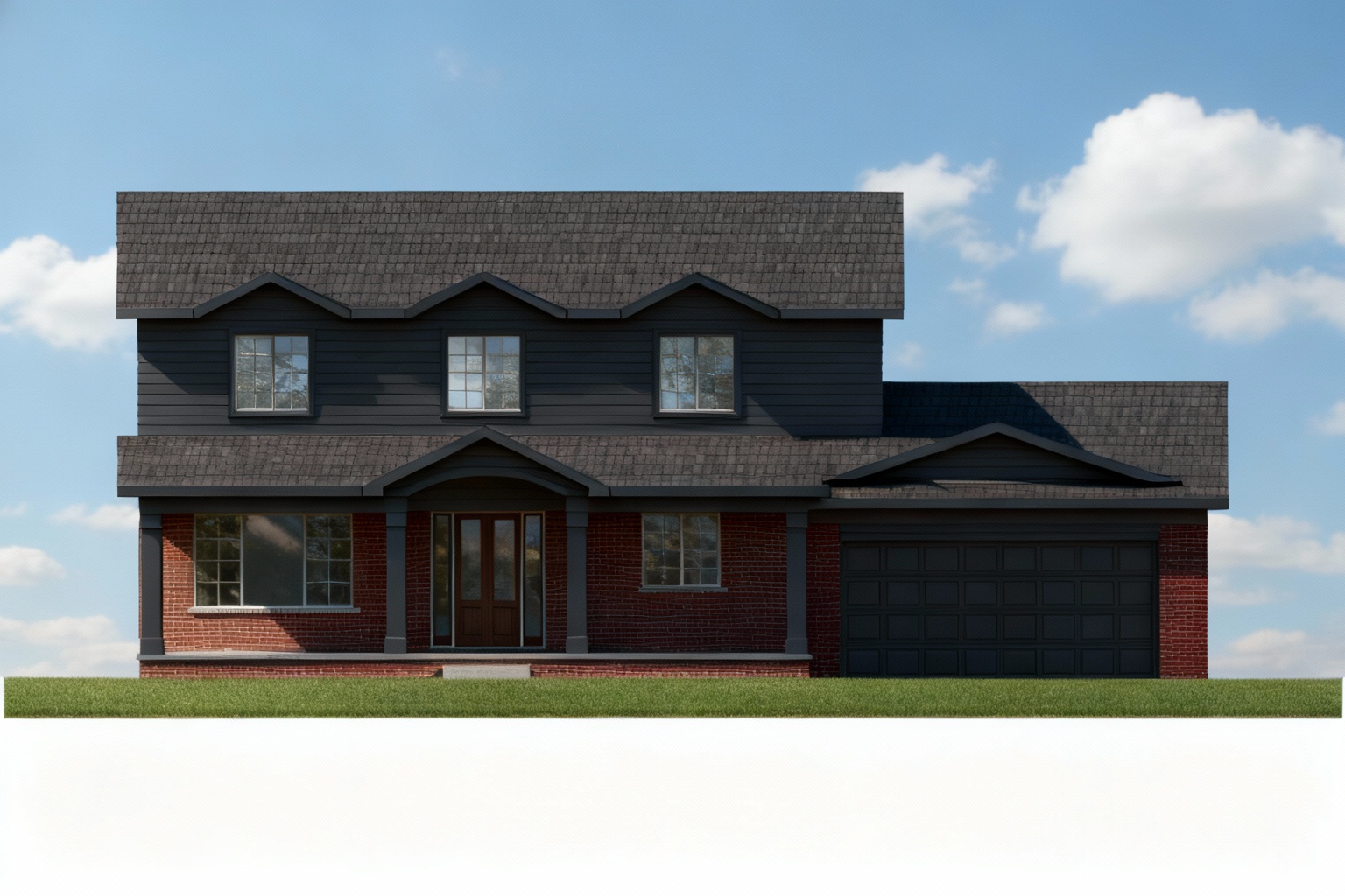 exterior shot architecture have dark gray siding 3d rendering with dark gray trim and column mixe brick with red and dark red please have soft shade and the picture more realistic and bright move shade to other side and use dack gray for garage door use more realistic glass window for second floor too noon sun shade more sun