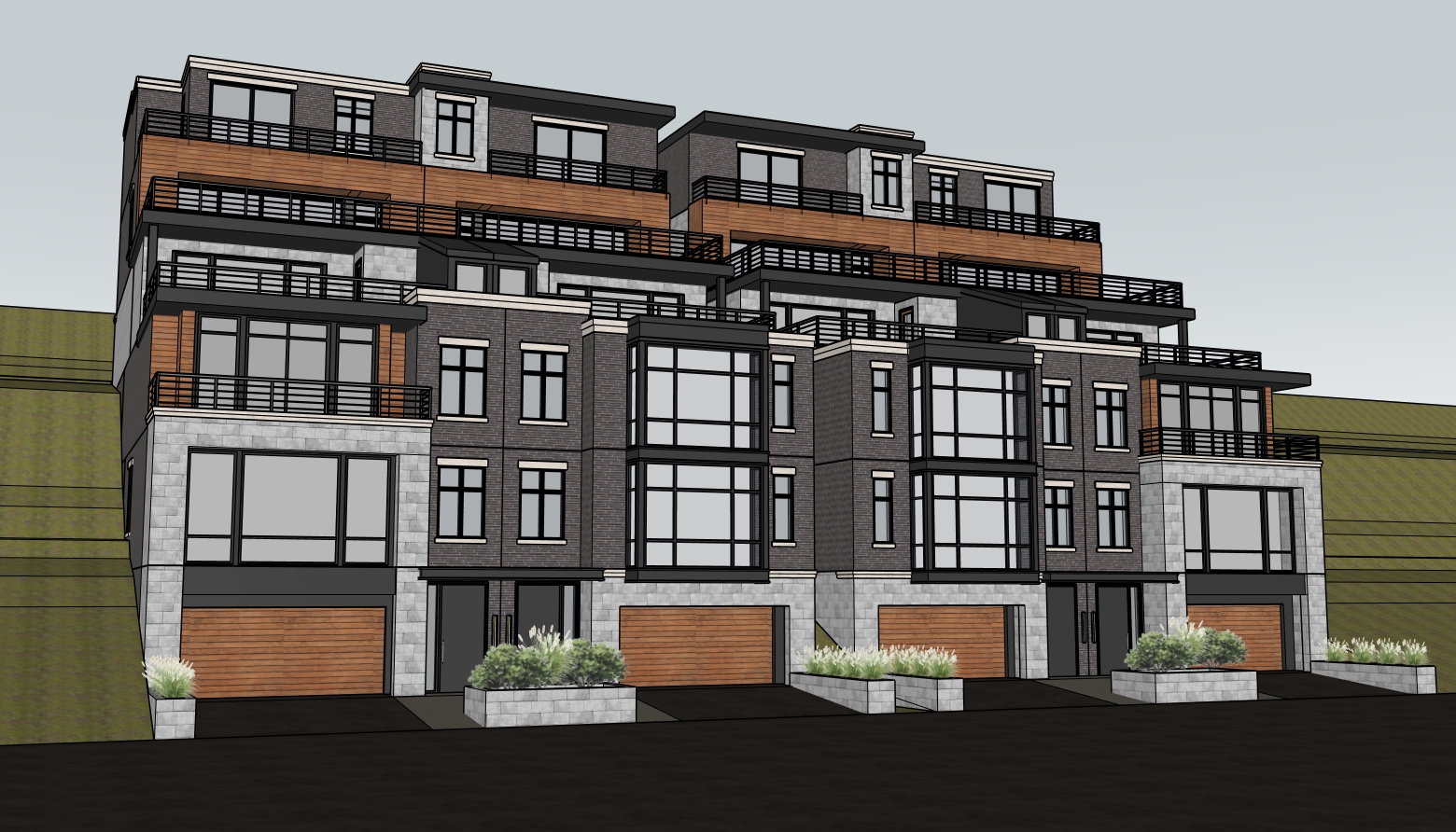 ultra photorealistic architectural rendering in a cinematic real time visualization style unreal engine d5 render quality late morning daylight with slightly angled sun creating soft defined shadows balanced exposure with no blown highlights low bloom and controlled dynamic range warm neutral color grading with subtle warm highlights and neutral shadows no blue tint natural material response with warm light reflecting off wood and ground surfaces slight contrast boost with clean crisp edges and subtle ambient occlusion clear atmosphere with no fog or haze but natural depth created through slight background softening and contrast falloff foreground and main subject remain sharp and detailed minimal curated landscaping with natural but slightly desaturated greenery no overgrown vegetation cinematic composition realistic sky with soft blue tones and light clouds professional architectural visualization style sharp focus 8k resolution lit and fully furnished interiors behind windows road with driveways to garages in foreground building built into hill front of building looking up at building on small hill with hillside historic mt adams city of cincinnati ohio in background and trees