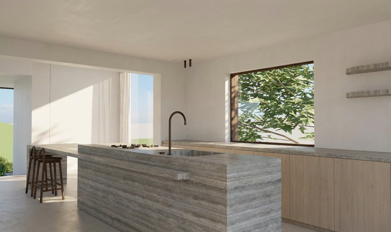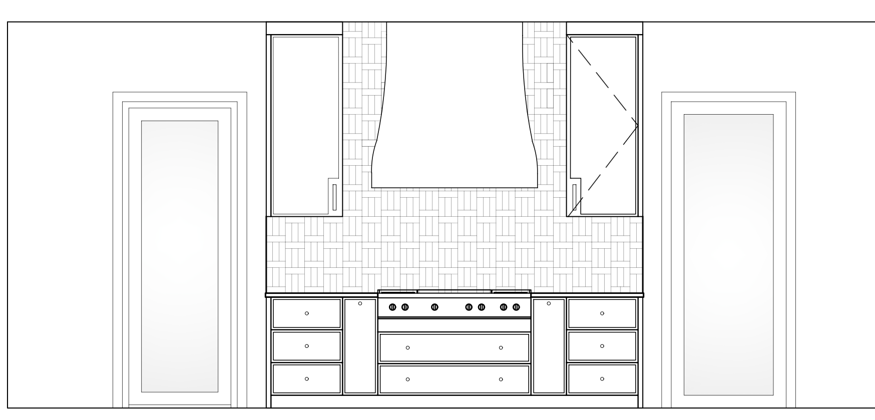 render a kitchen elevation using the provided cad linework as the base millwork finish benjamin moore vanilla milkshake warm off white satin finish walls and door casing benjamin moore simply white clean white matte eggshell finish cabinet door fronts slim shaker profile minimal frame clean lines operating doors shaker style with inset glass panels clear glass simple frame no mullions unless shown hood fan custom plaster finish colour matched to millwork vanilla milkshake smooth matte texture backsplash 1 6 x 6 glossy white subway tile follow exact layout pattern indicated in elevation high gloss finish with subtle grout lines light grey or white countertop white with subtle beige veining soft natural look low to medium gloss appliance wolf 48 sealed burner rangetop srt486g centered as shown stainless steel finish with realistic reflections and dark knobs lighting soft even natural lighting avoid harsh shadows maintain clear tonal distinction between warm millwork and crisp wall white