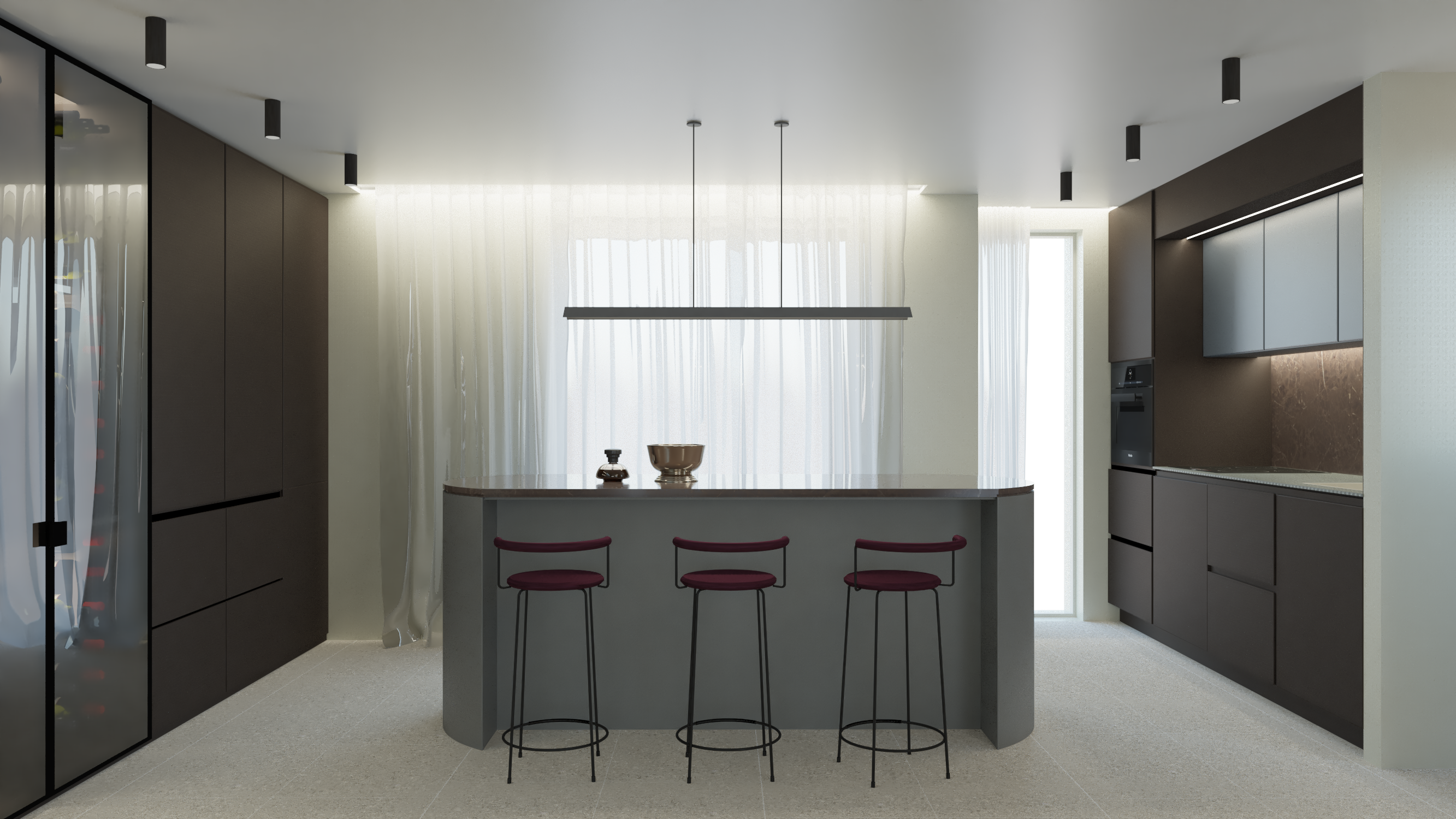 make the brown cabinets more realistic wood make the down part of the kitchen island concrete and without hidden light add hidden lights at the wine cabinet keep the hidden lights at the kitchen and the curtains make the glass at the wine cabinet more transparent