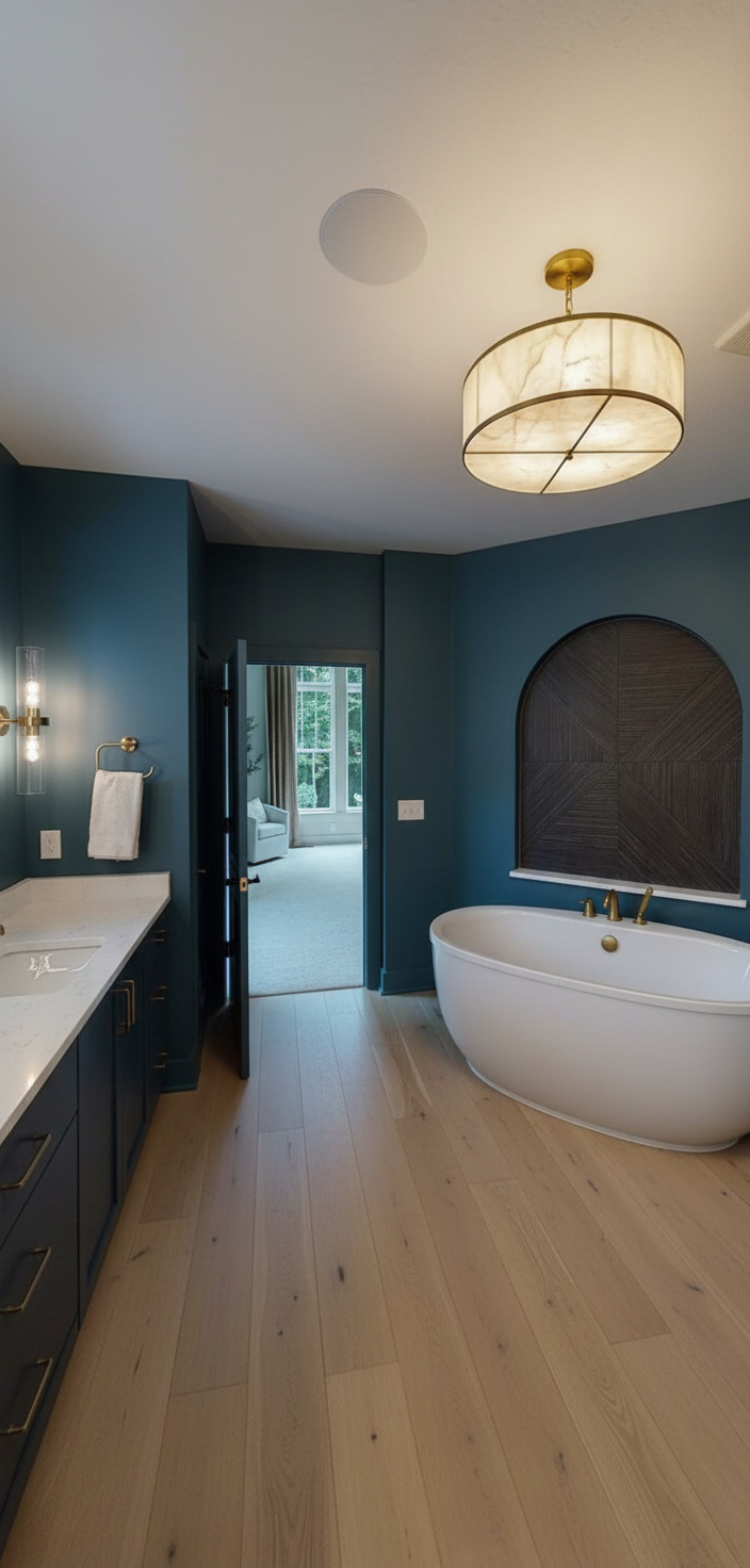 change floors to european white oak flooring change the chandelier to round alabaster stone chandelier change the cabinets to dark charcoal color change the walls to a moody color put a closed door in replace the tile behind the tub with the reference image tile