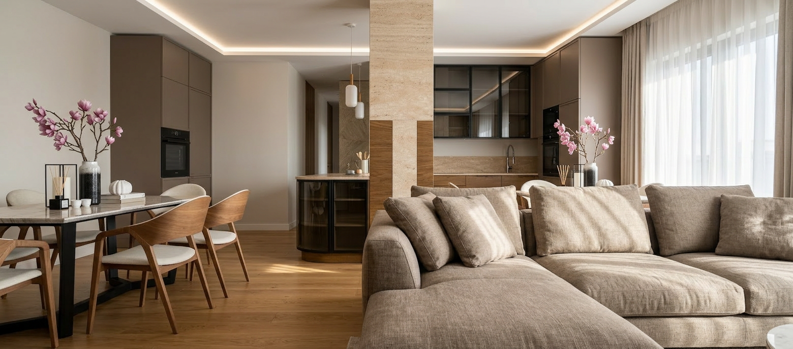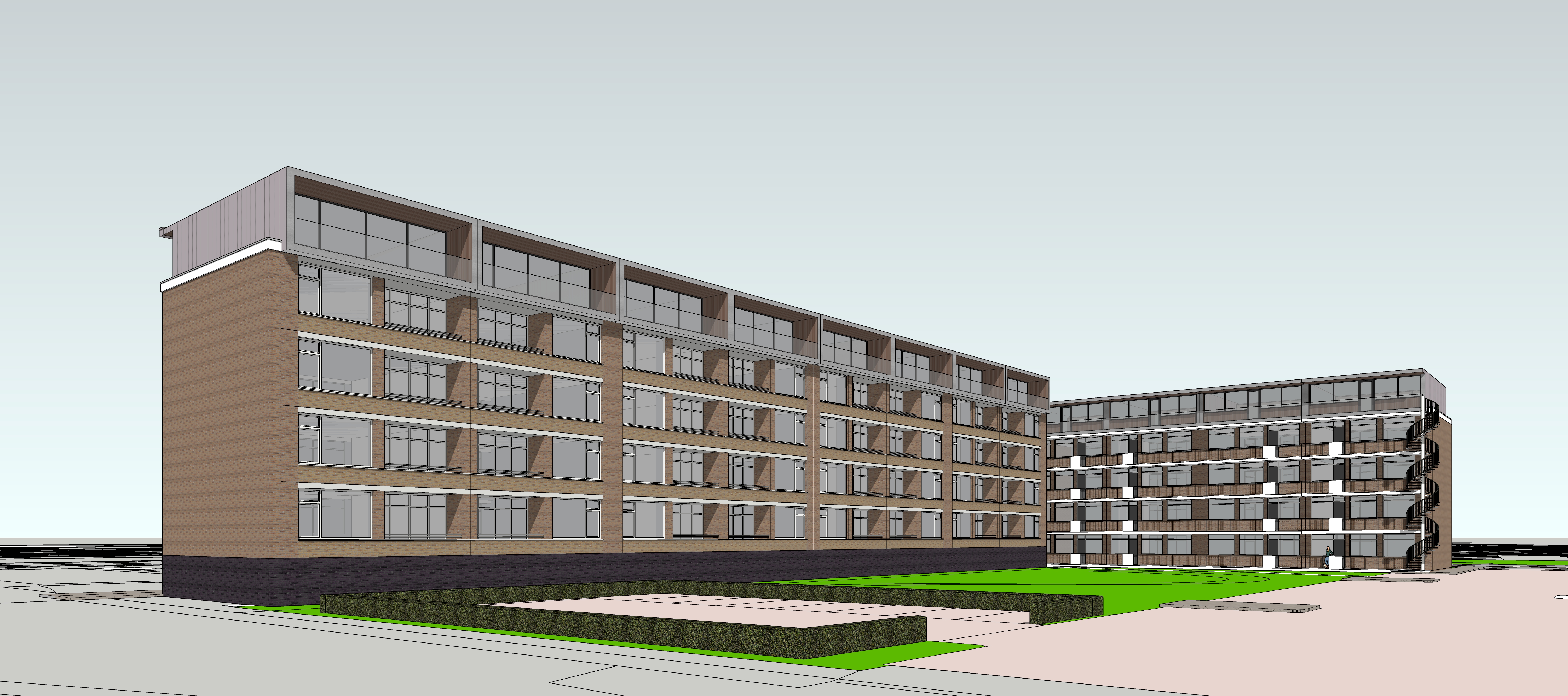 make this a photorealistic scene add some people trees and bushes the weather is sunny with a few clouds the grey parts in facade are zinc with vertical lines there are parking places on ground level the baluster on top level is made of glass keep original viewpoint no glass baluster on rooftop