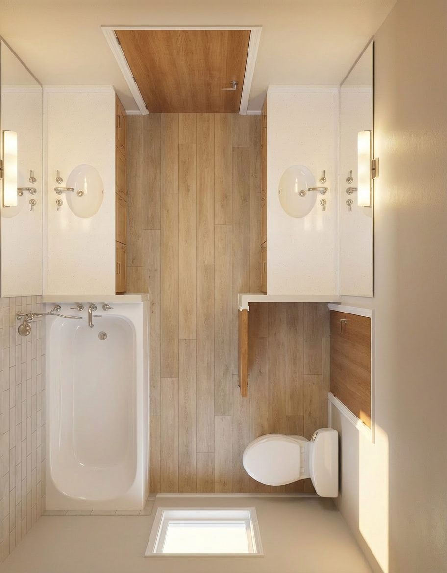 preserve the exact layout camera angle and placement of all elements do not move or redesign anything remove the extra door beside the toilet completely and replace it with a continuous drywall wall match the surrounding painted wall color and finish do not extend the wood material onto this wall keep all other materials and elements the same