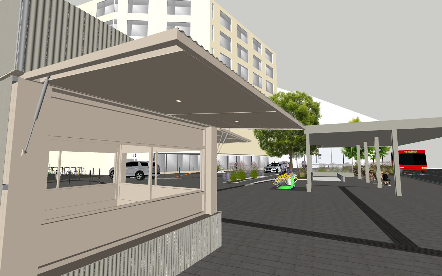 create an ultra realistic architectural visualization of the provided sketchup model of a kiosk with a shelter awning important preserve exactly the same materials and colors from the original sketchup model do not change replace reinterpret or recolor any materials on the kiosk or the shelter the kiosk and the shelter must look exactly as they do in the sketchup model in terms of color and material keep all original textures and finishes for these elements the rest of the scene can be rendered normally with realistic lighting shadows environment and materials use natural daylight realistic shadows and reflections high quality photorealistic rendering physically based materials for the environment focus on creating a clean ultra realistic architectural visualization while strictly preserving the kiosk and shelter appearance from the input model