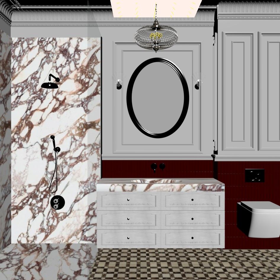 better quality the black accesories make them brushed gold the walss and profiles and cornice with just a little bit of old ish decorative but just a touch the dark red is a beautiful tile ceramic