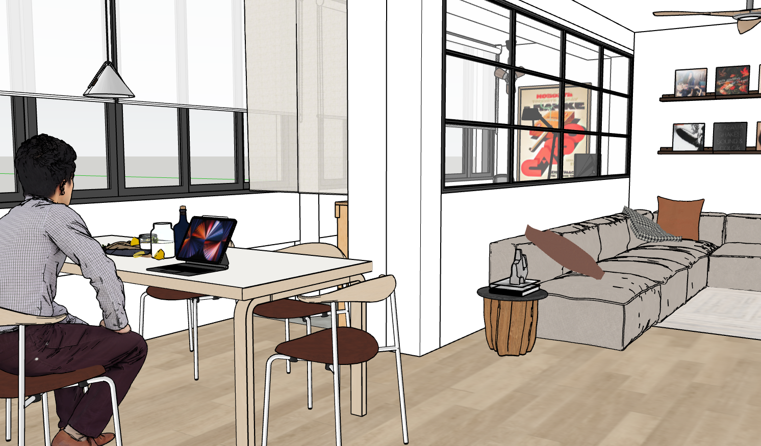 morning sunlight from windows soft illumination trees outside window ceiling lamp turned on