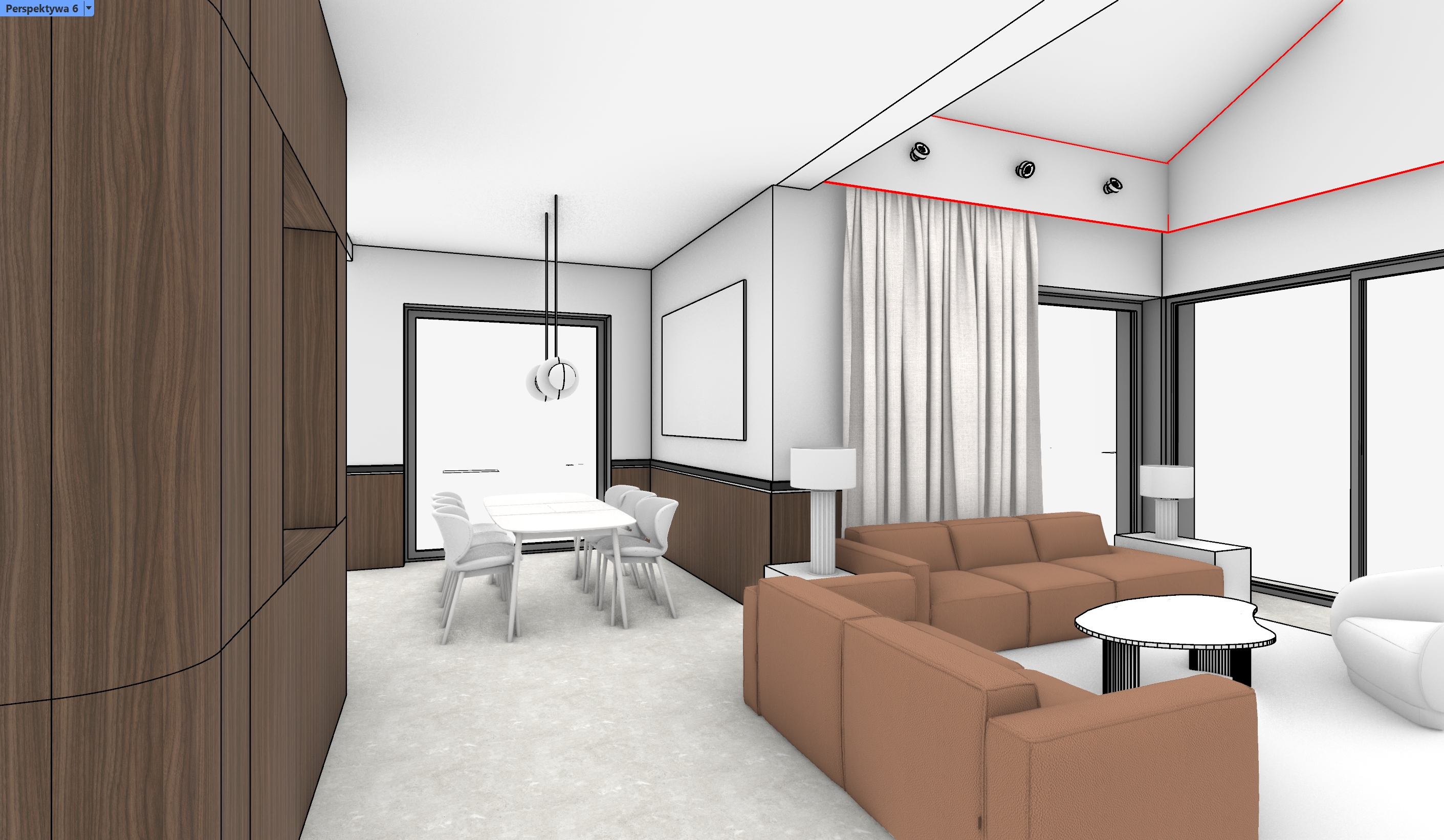 photorealistic interior visualization of a modern living room preserving exact geometry layout camera position proportions and all architectural elements from the input image with no modifications to walls openings furniture placement or spatial composition the scene should be styled as a modern minimalist interior with warm natural materials featuring light oak wood wall panels with realistic grain subtle variation and matte finish soft off white or cream fabric sofas with detailed upholstery and natural folds light grey polished concrete or microcement flooring with slight reflectivity smooth matte white painted walls sheer floor to ceiling curtains with soft translucency and black metal details such as table bases and accents with subtle reflections lighting should be highly realistic with warm indoor tones around 3000k 3500k including soft recessed ceiling spotlights with accurate light falloff subtle indirect ambient lighting and natural daylight entering from the right side diffused through curtains with balanced exposure soft shadows and global illumination include realistic imperfections such as slight material variation and micro textures high quality reflections and soft shadows and a subtle depth of field focused on the seating area while maintaining the tv dog portrait artwork lamp coffee table and all furniture exactly as placed the render should be ultra photorealistic in high resolution 4k using physically accurate pbr materials global illumination and ray tracing with no stylization redesign or addition or removal of objects and the camera should remain as the original perspective view at eye level with a natural lens of approximately 28 35mm