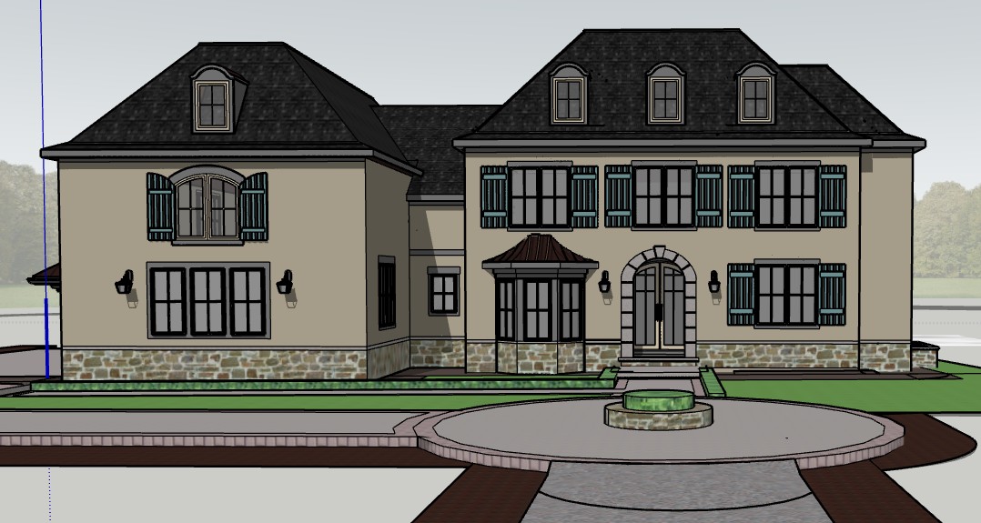 french country estate hyper realistic rendering with mature hardwood woods behind and ivy on either side of the recessed front porch show the exterior coach lights on
