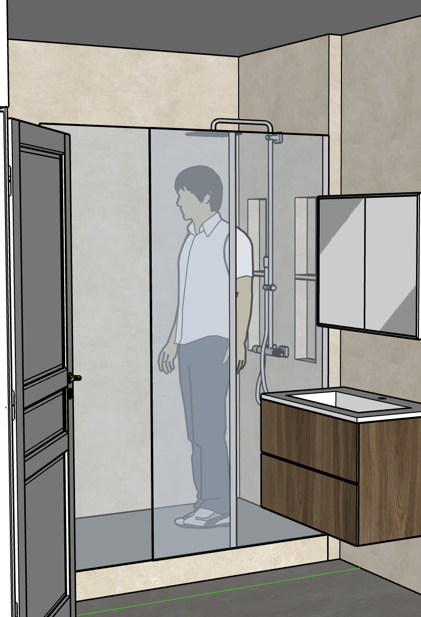 salle de bain moderne intemporelle pas de wc juste douche et meuble vasque encastr tons beige niches dans la douche uniquement avec shampoings gel douche droite