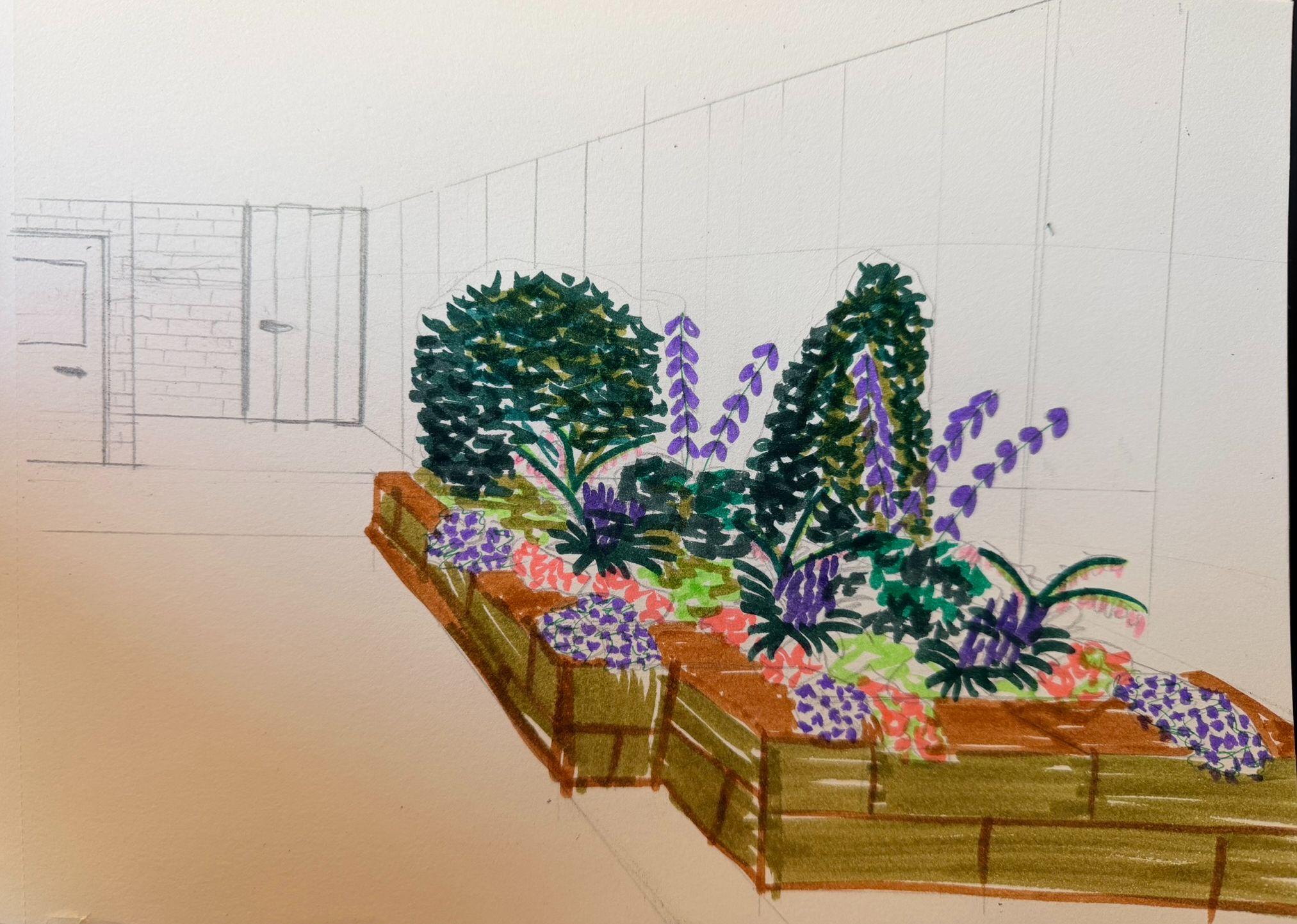 garden with a brick shed paving to wooden gate and a raised border against a wooden fence with the following plants viburnum 3x azalea 6x foxglove 5x bellflower 7x meadowsweet 3x solomon s seal 3x lilyturf 9x phlox 7x campanula 6x veratrum