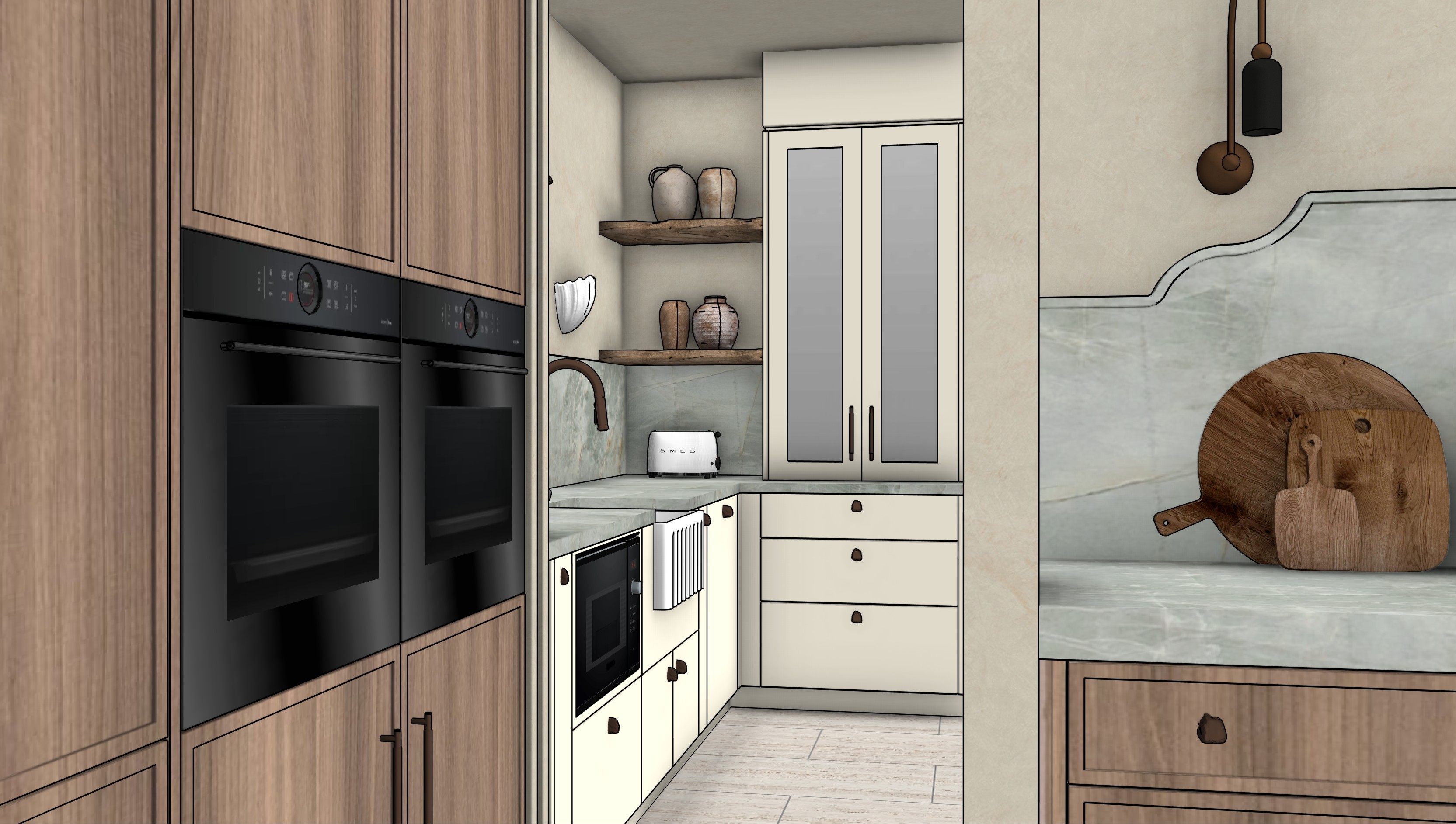 flemished glass insert to above bench white cupboard the white cupboard are white flat panels no shaker the timber cabinetry is a soft mid tone not dark ensure glass insert in white cupboards above bench is flemished