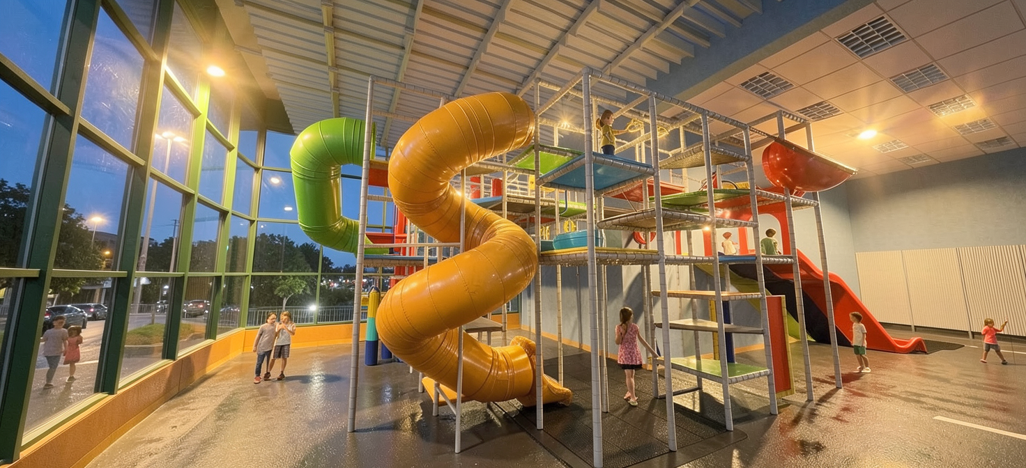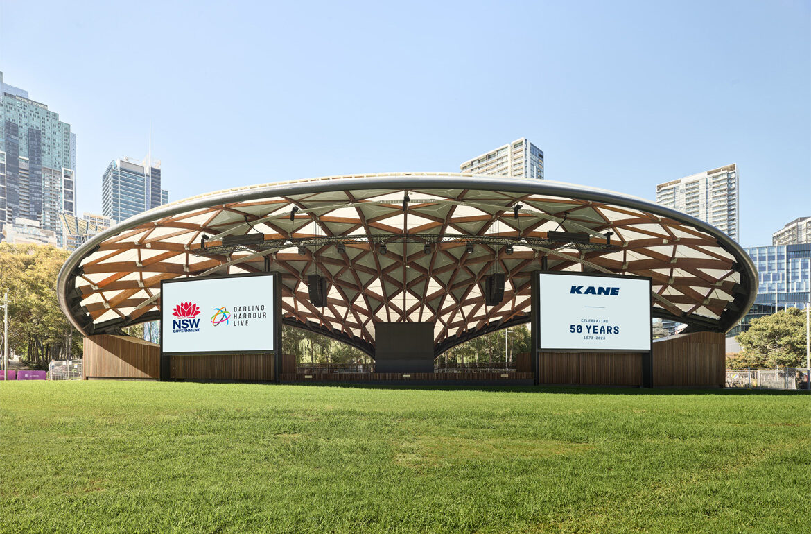 a futuristic open air amphitheater with a sleek modern design the roof structure is composed of interwoven wooden beams in warm brown tones with a gentle curve creating an inviting space the sky is a clear bright blue complementing the lush green lawn that stretches in the foreground tall modern buildings with reflective glass in light blue and grey stand in the background enhancing the urban atmosphere captured in the soft golden light of early morning the scene is tranquil and inspiring embodying a sense of innovation and harmony with nature architecture
