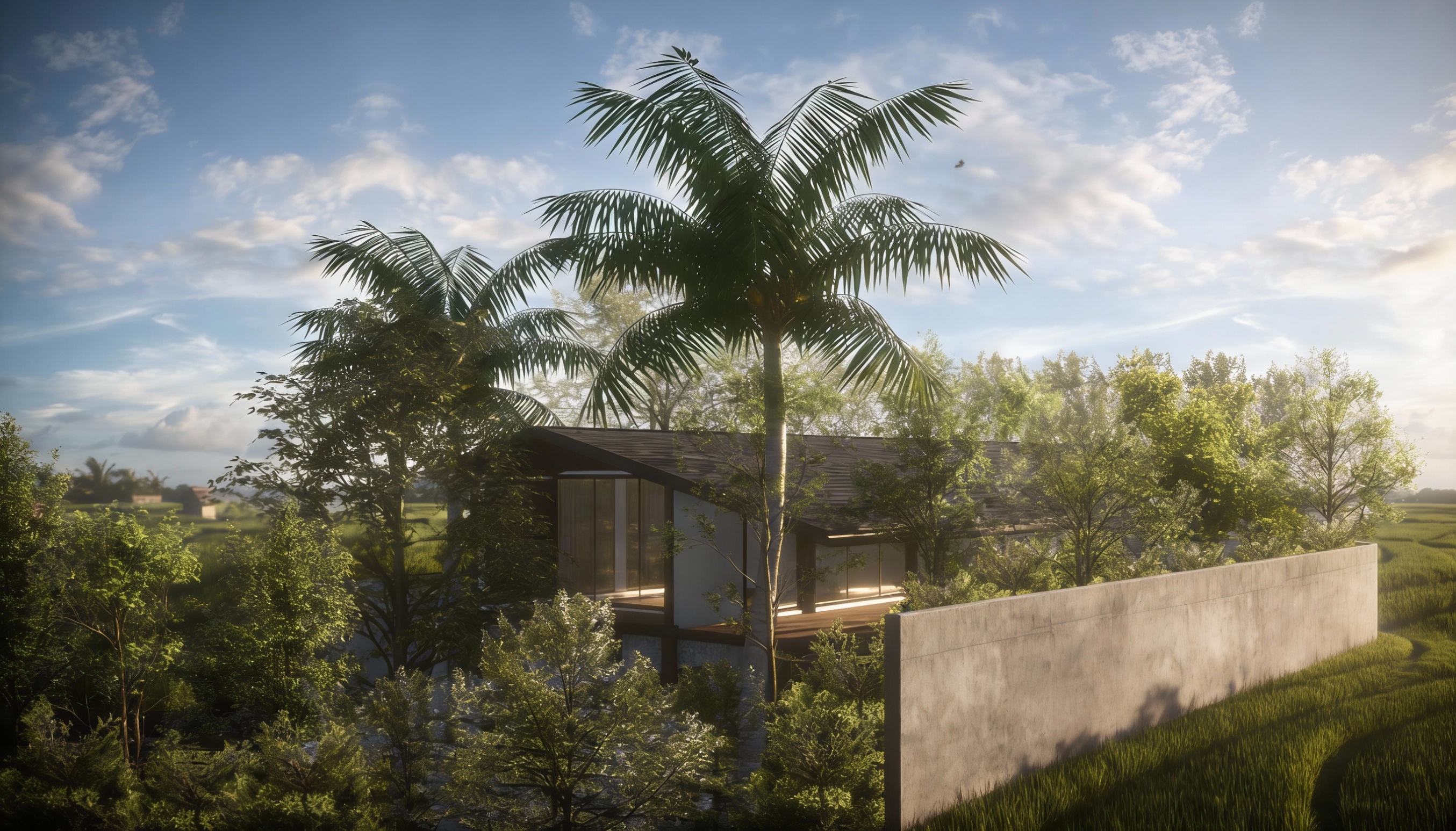 night view with some setting sun light still visible enhance the materials and lighting effects in the input image add people sitting at the most of the tables having dinner dressed casually for a beach resort add some waiters serving the guests add some people at the bar having drinks add some small lanterns hanging in the trees outside add people dining in the tables in the center of the view add some wear to the wood flooring material make the light from the hanging pendant lights warmer in color add people at the high top tables in the center of the space having drinks add led lighting under the bar top add more people having dinner at the tables