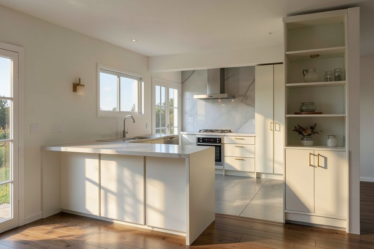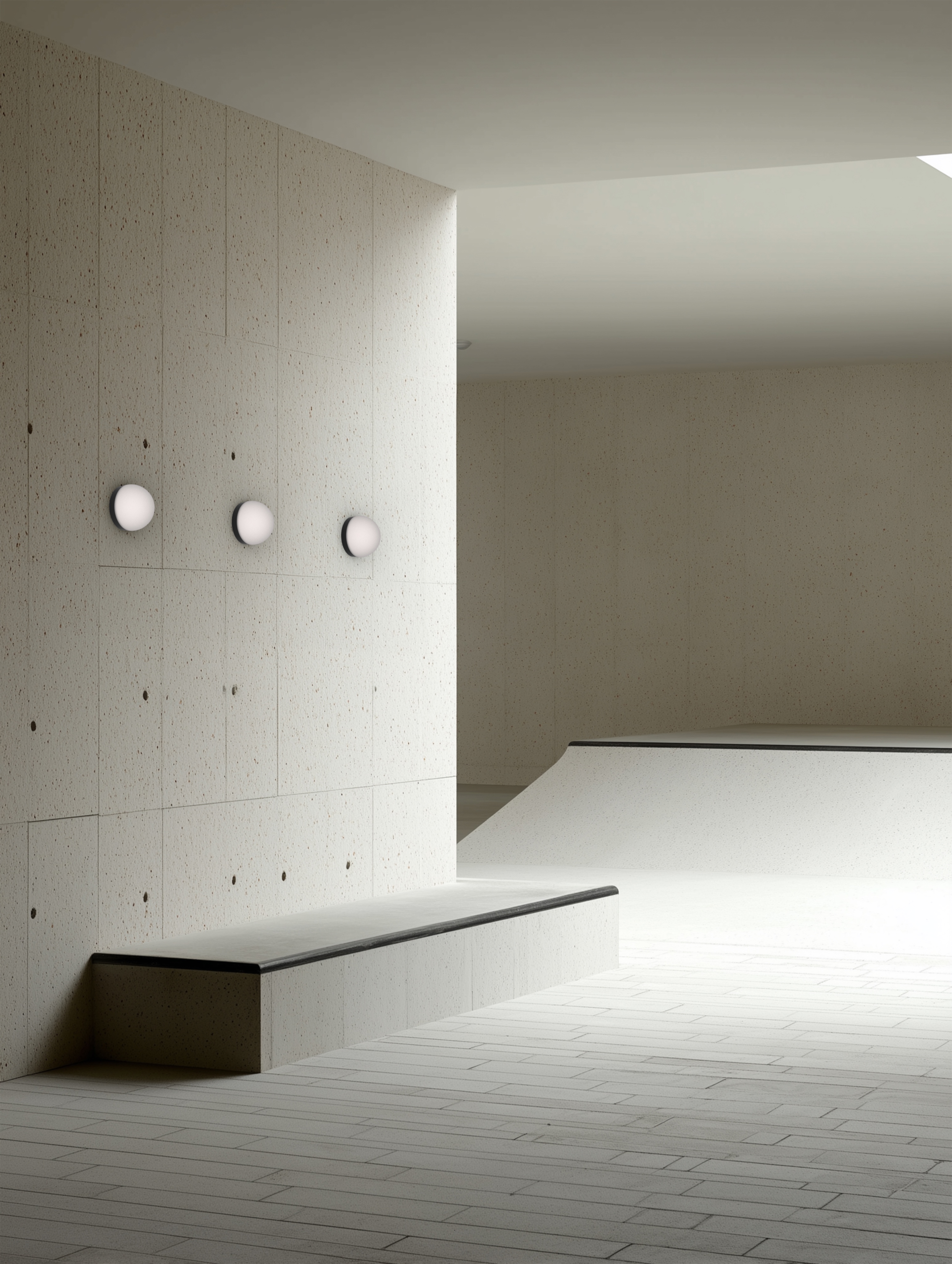 minimalism interior shot render a minimalist architectural space featuring smooth light beige walls with a subtle textured pattern include three modern wall sconces with soft white lighting the floor and ceiling should be a clean muted gray with subtle tile patterns to enhance the simplicity emphasize the clean lines and open space with soft natural lighting creating a serene calm atmosphere the overall ambiance should be contemporary and tranquil capturing a sense of quiet elegance and modern minimalism architecture
