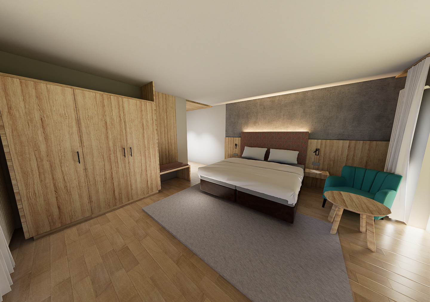 render a beautifully designed modern bedroom with a cozy and warm atmosphere include light wood tones for the floor and wardrobe a gray textured wall behind a bed with white bedding add a teal armchair and a wooden round table use soft ambient lighting to create a calming and inviting ambiance
