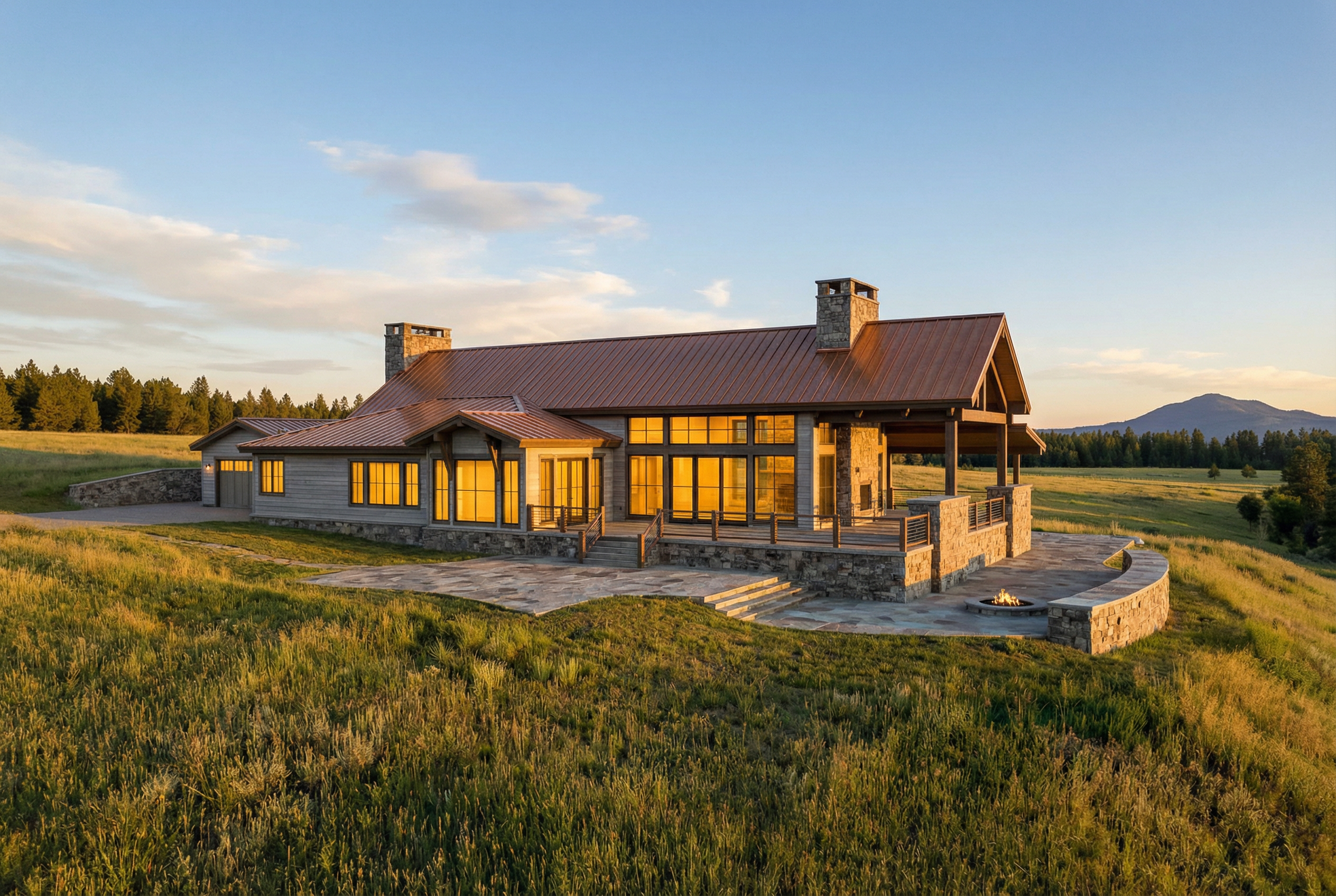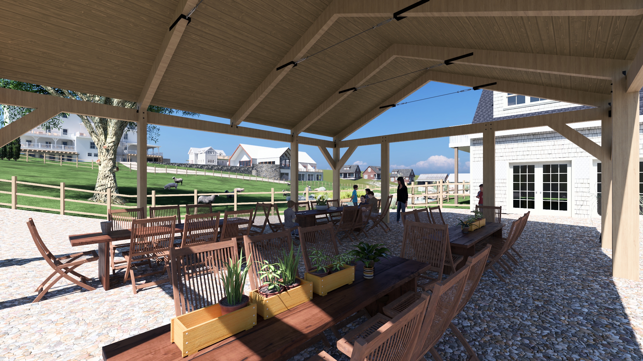 prairie style exterior shot render this scene with the location being block island ri with summer foliage and landscaping and people using the pavilion make the wood appear as weathered southern pine wood architecture