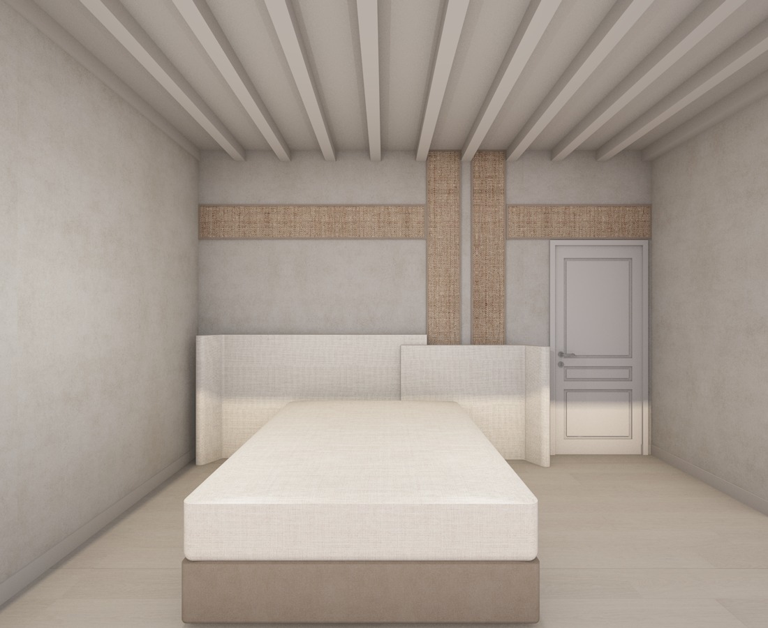 create a highly realistic render of a minimal bedroom with a calm and serene atmosphere the space feels soft warm and harmonious with a refined and natural aesthetic the bed is centered in the room featuring a fully upholstered base and headboard in a light beige fabric with a soft texture the design is clean minimal and monolithic behind the bed the wall features a structured composition of vertical and horizontal elements there are fabric textured panels in a warm beige tone framed between light wood details creating a subtle architectural pattern two vertical panels extend from the floor up to the ceiling intersected by a horizontal band that runs across the wall the walls are finished in a light beige microcement giving a smooth and continuous appearance the ceiling features exposed beams painted in a soft off white tone adding rhythm and depth to the space on the right side there is a simple classic style door in a light neutral color the flooring is in a light natural tone maintaining the overall soft and minimal palette the space is illuminated entirely by artificial lighting with a soft diffused and even glow creating a calm and controlled atmosphere ultra realistic render high resolution interior design magazine photography style