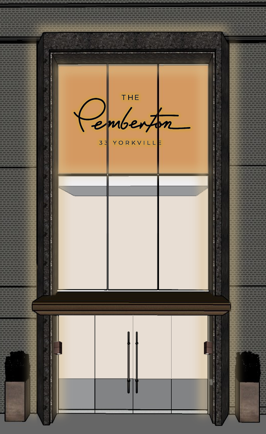 create a photorealistic architectural rendering using the provided sketchup model as the base geometry maintain the exact proportions layout and architectural elements of the model do not modify geometry openings dimensions or composition this is the main entrance of a luxury condominium building with a prominent canopy architecture preserve exactly rectangular canopy projecting above the entrance glass curtain wall above the canopy revealing the slab of the upper floor behind the curtain wall a feature wall in a warm terracotta burnt orange tone centered on this wall building logo with soft led backlighting halo glow effect main entrance doors below canopy glass doors with elegant metal framing respect original proportions divisions and color two middle doors must be automatic sliding glass doors door handles must remain unchanged see specifications below critical facade cladding graphite gray perforated metal panels the perforation pattern must be rectangles with rounded edges alternated location panels must align with facade joints and divisions keep perforations sharp and clearly visible materiality main cladding graphite gray perforated panels entrance primary frame crystal black stone matte finish secondary recessed frame black terrazzo with small white orange and yellow speckles clearly set back canopy bronze finish canopy underside visible bronze metallic grid open lattice detail keep everything exactly the same do not modify architecture materials or lighting concept adjust the metal grid under the canopy so that the pattern is more open and less dense increase the size of each square module to a medium scale ensuring that the grid is clearly legible from a distance the spacing between the metal members should be wider creating a more balanced and refined composition rather than a tight or compressed pattern maintain a clean consistent rhythm with evenly sized squares avoid small or overly intricate detailing the grid should feel elegant intentional and proportional to the canopy size with fewer larger modules instead of many small ones keep the bronze brushed finish and the reflected lighting effect unchanged curtain wall mullions white aluminum glass clear with subtle realistic reflections feature wall warm terracotta burnt orange for contrast curtain wall very important maintain full transparency and exact proportions white mullions with correct spacing interior must be visible structural slab orange feature wall logo must have soft led backlighting clearly visible in dusk night lighting high priority scene must be set at dusk or early night blue hour to emphasize lighting warm lighting 3000k soft and realistic include all of the following linear led strips around the exterior entrance frame around the curtain wall perimeter below the orange feature wall under the logo lighting must be continuous even and not overexposed canopy lighting integrated above the canopy washing the curtain wall and upper feature wall logo soft led backlit letters halo glow clearly visible sconces champagne bronze finish slightly smaller scale mounted slightly higher soft downward light wash minimal visible light source indirect effect door handles do not change geometry 40mm x 40mm square tube finish bronze include 304mm returns at top and bottom subtle corrugated metal texture maintain exact placement and proportions additional elements two planters in original positions do not move or redesign ada push button located on the right side positioned below the sconce must remain unchanged atmosphere style evening dusk blue hour cinematic lighting high realism materials soft shadows and global illumination strong contrast between dark facade and warm lighting luxury residential aesthetic similar to high end yorkville condominium entrance clean urban sidewalk minimal distractions camera eye level frontal view centered composition slight wide angle lens 24 35mm symmetrical framing emphasizing canopy and illuminated feature wall final instruction strict enhance realism only through materials lighting and rendering quality strictly preserve all geometry proportions facade patterns and architectural elements from the sketchup model if any element especially perforated panels lighting placement or curtain wall proportions is incorrect regenerate until it matches exactly