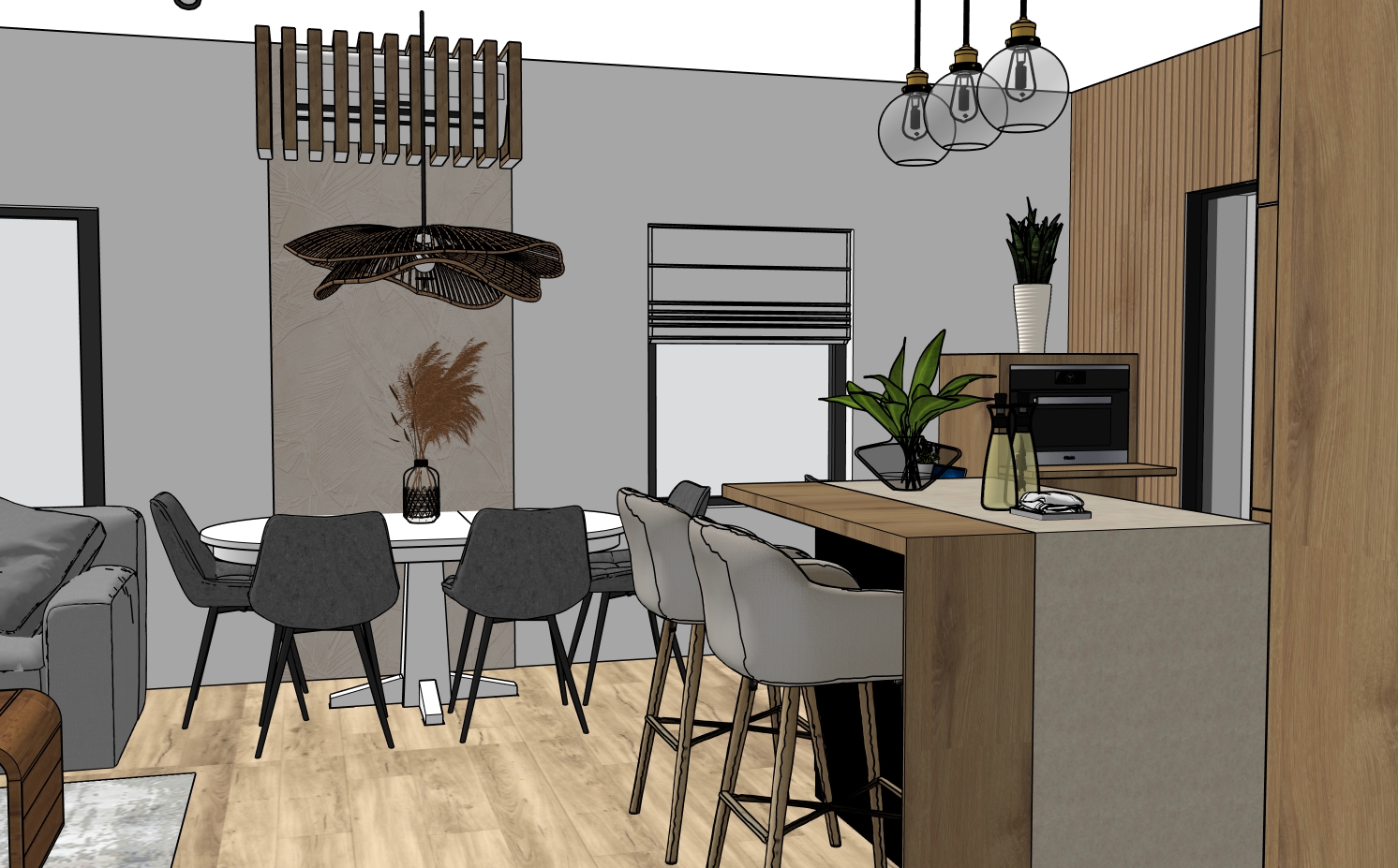 the same modern kitchen interior warm wooden cabinetry with a natural oak finish matte black fixtures and appliances soft beige countertops sleek gray and white bar stools transparent glass table decor and vibrant green indoor plants ambient lighting with black pendant lamps and a cozy atmosphere bright and airy space with a minimalistic contemporary design