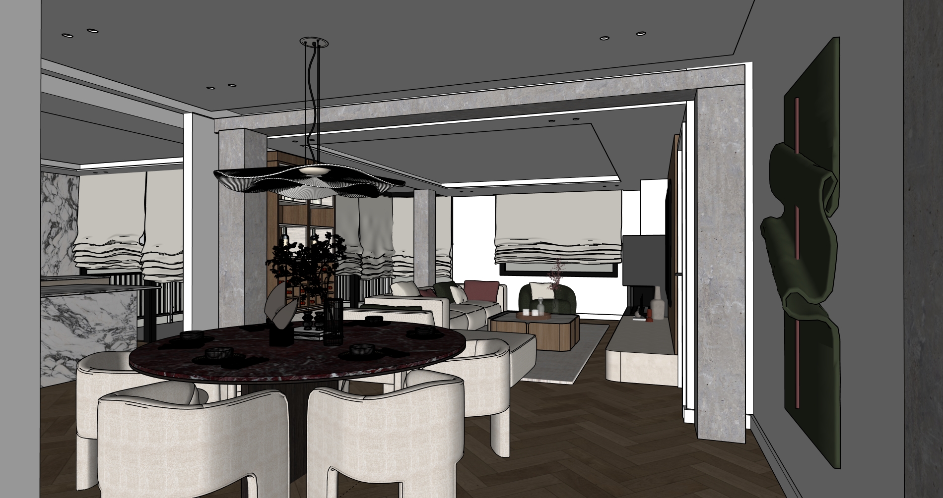 crea una imagen fotorealista a partir de este sketchup realza las texturas e iluminacion la escultura verde de la derecha es textura metacrilato