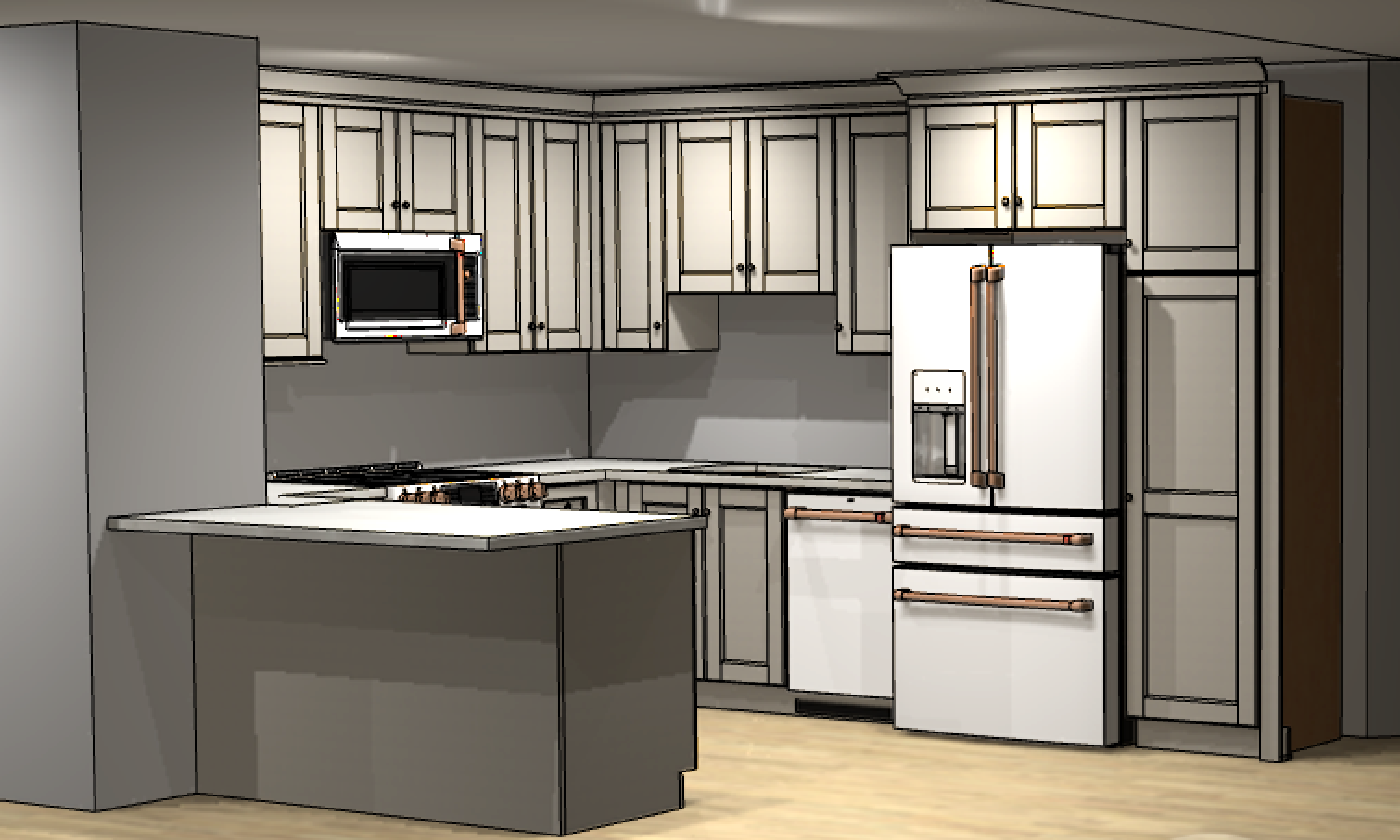create a beautifully rendered modern kitchen in a warm and inviting atmosphere use the lightest grey for the cabinets with subtle brushed nickel handles for a modern touch the walls should be a gentle white complementing a polished white quartz countertop the refrigerator and microwave are sleek white gloss with chrome accents the flooring is a warm natural oak wood creating a cozy contrast add seafoam green long subway tiles add soft ambient lighting to highlight the textures and finishes with gentle shadows for depth and realism add a stainless steel bridge faucet