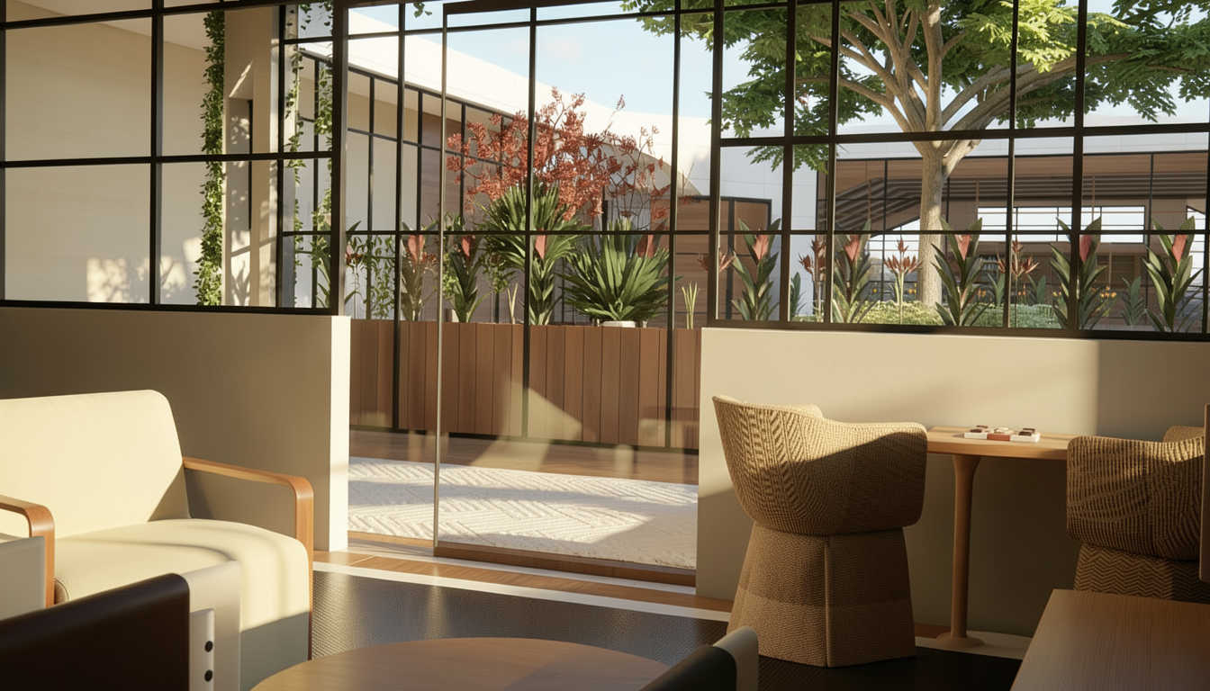 don t change the camera angle no direct sunlight in the space add hawaii ocean no corals but abstract fish themed elegant mosaic art on the fascia this mosaic art is made of white beige champagne and light blue tiles fill the shops with souvenir shops don t change the gate lounge on the left add cove light on the ceiling remove pinkish sky light behind the glass