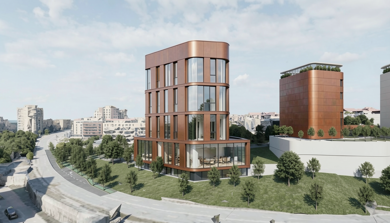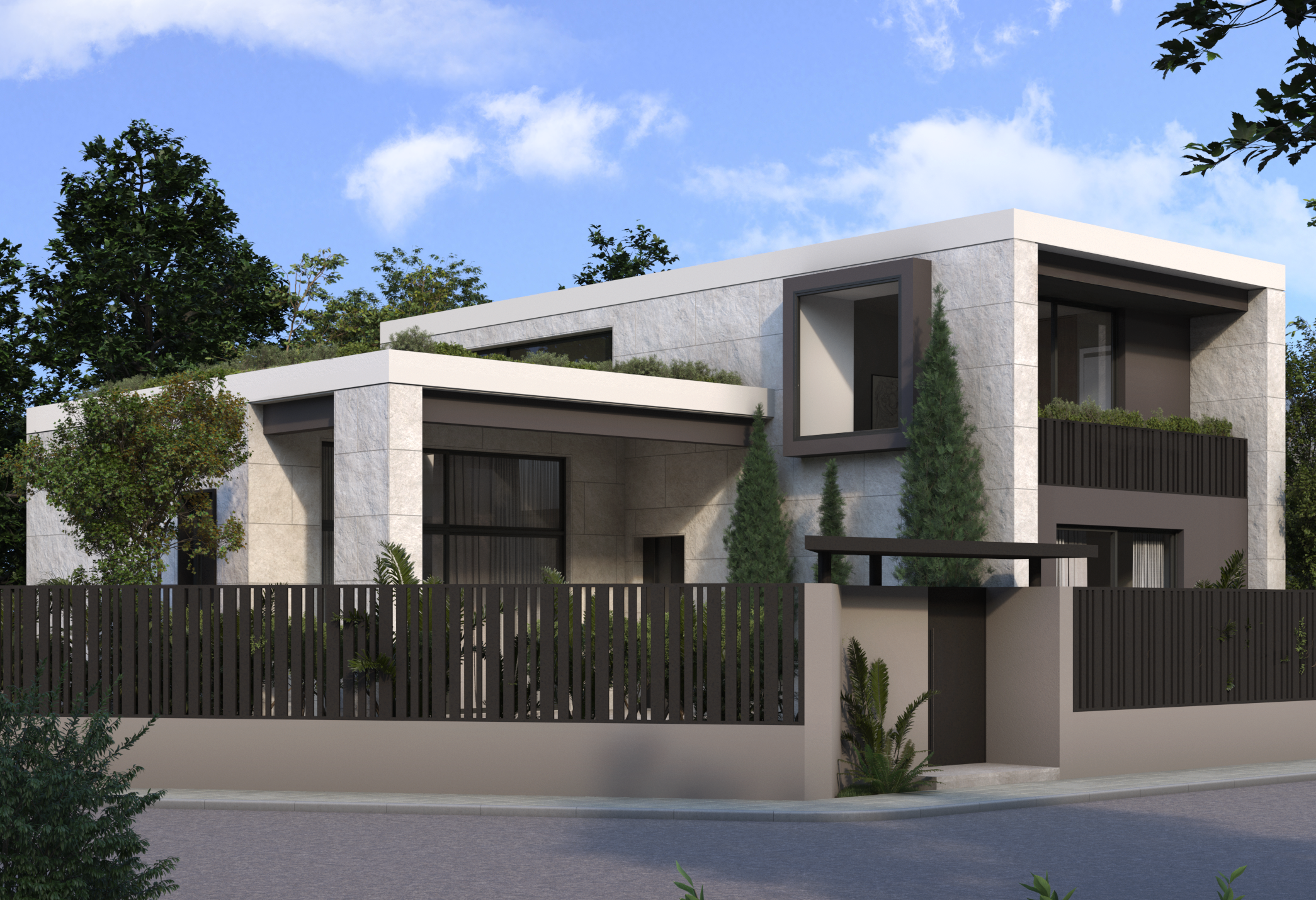 make this image ultra realistic architectural photography of a modern residential building located in vari attica greece preserve the exact proportions and geometry of the building and fence no street signs hyper realistic textures and materials physically accurate lighting global illumination crisp realistic shadows and reflections dry asphalt road with natural sun highlights and subtle surface texture bright sunny midday lighting with clear blue sky strong but natural sunlight sharp yet realistic shadow definition accurate light direction soft atmospheric depth high dynamic range true to life colors natural contrast realistic sun reflections on glass and metal surfaces 8k resolution dslr full frame photography style 24 35mm lens sharp focus corrected vertical lines no distortion no artistic stylization no cgi look
