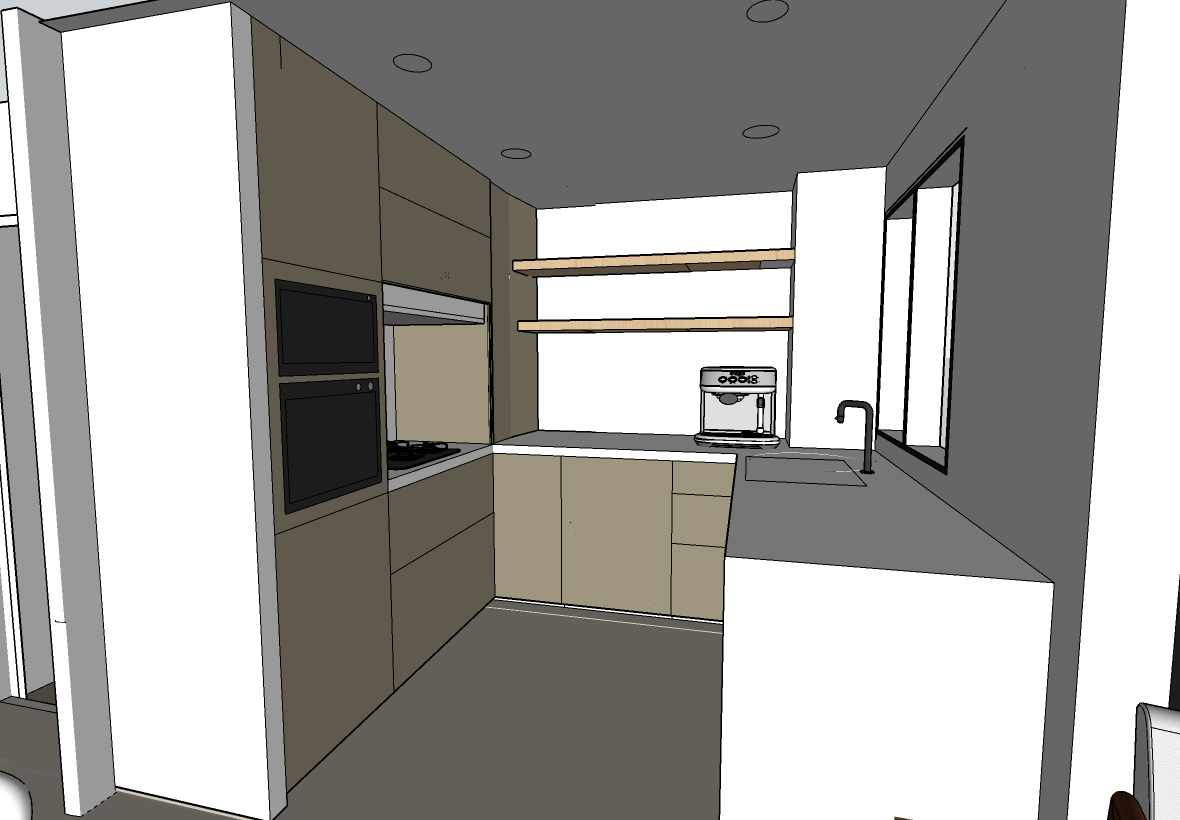 create a modern kitchen interior with sleek minimalistic design use dark muted khaki for cabinets complementing white gloss countertops and end panels and a matte muted beige for the floor tiles add warm wood elements for the shelves above the counter make the walls a clean white to enhance brightness use dark stainless steel finish for appliances and fixtures incorporate large windows on the right allowing natural light to flood the room creating a bright inviting atmosphere with a cozy contemporary feel