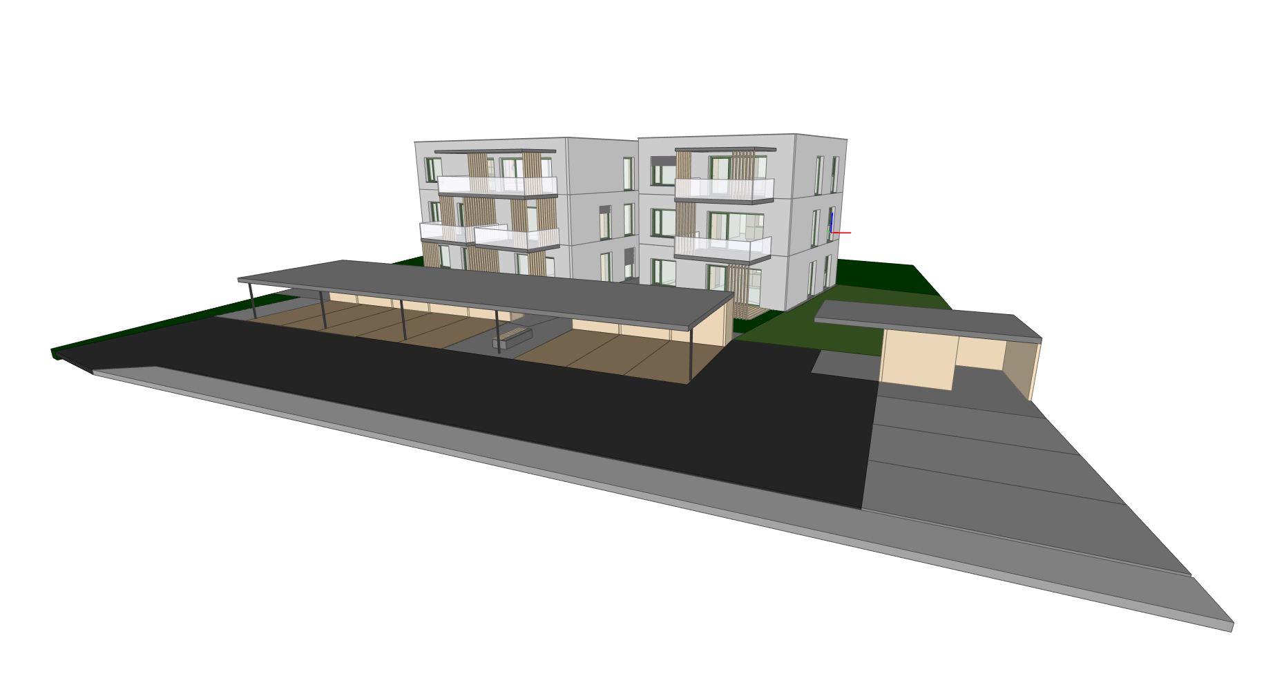 highly realistic architectural exterior visualization of a modern three story residential building in a quiet location without visible neighboring buildings detached clear cubic structures with flat roof light mineral plaster facade in warm gray with fine surface texture balconies with perforated matte green metal railings vertical wooden slats as high quality facade elements minimalist and elegant evening twilight blue hour soft natural ambient light warm interior light from the windows realistic global illumination physically correct interplay of light and shadow calm and high quality atmosphere realistic modern landscape architecture without foreign buildings in the background natural european planting with ornamental grasses perennials ground cover plants and individual small trees loosely and organically arranged no exotic plants no exaggerated greenery different natural shades of green realistic leaf and plant structure foreground with modern carport structure made of steel with flat roof realistically parked vehicles asphalt and concrete surfaces with subtle signs of use camera at eye level slight wide angle perspective professional archviz composition no neighboring houses no urban density no cgi look no exaggeration photorealistic real estate visualization very detailed calm high quality