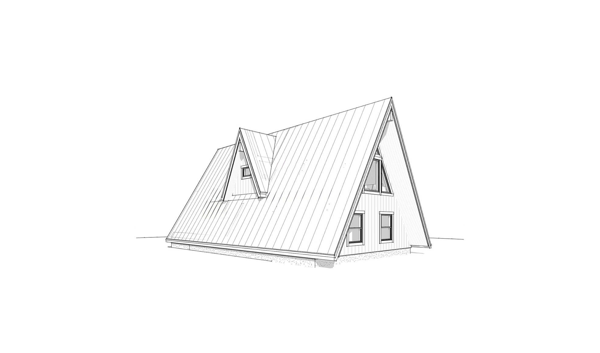 front view of a clean rustic a frame cabin architectural exterior home rendered in cinematic vibrant day time lighting with big clouds in the sky cabin in the forrest with streaks of light coming through the trees warm glow and reflections off of the windows rustic select grade vertical warm wood cedar siding green manicured landscape around structure with gardens and patches of grass black standing seam metal roof with straight seams prominent cinematic forest with big douglas fir trees and ferns and moss surrounding behind the house in the background high fidelity photorealistic visualization crisp shadow falloff refined facade geometry soft atmospheric depth premium architectural photography mood ultra clean composition and materials dark trim around windows flat roof photorealistic render