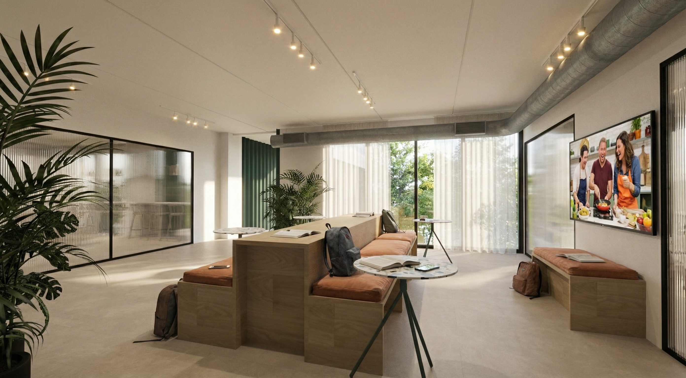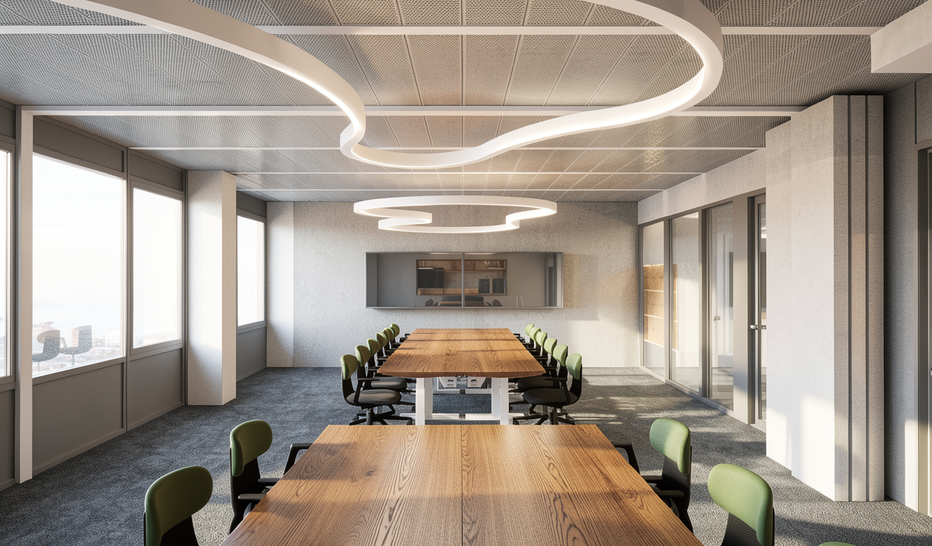 transform the provided office interior image into a high end photorealistic render with naturalistic atmosphere while keeping everything exactly the same position same proportions same seating same ceiling curves same wall finishes same carpet surface same materials same colors and same spatial configuration do not move or alter any objects geometry textures colors or furniture positions table tops in oak